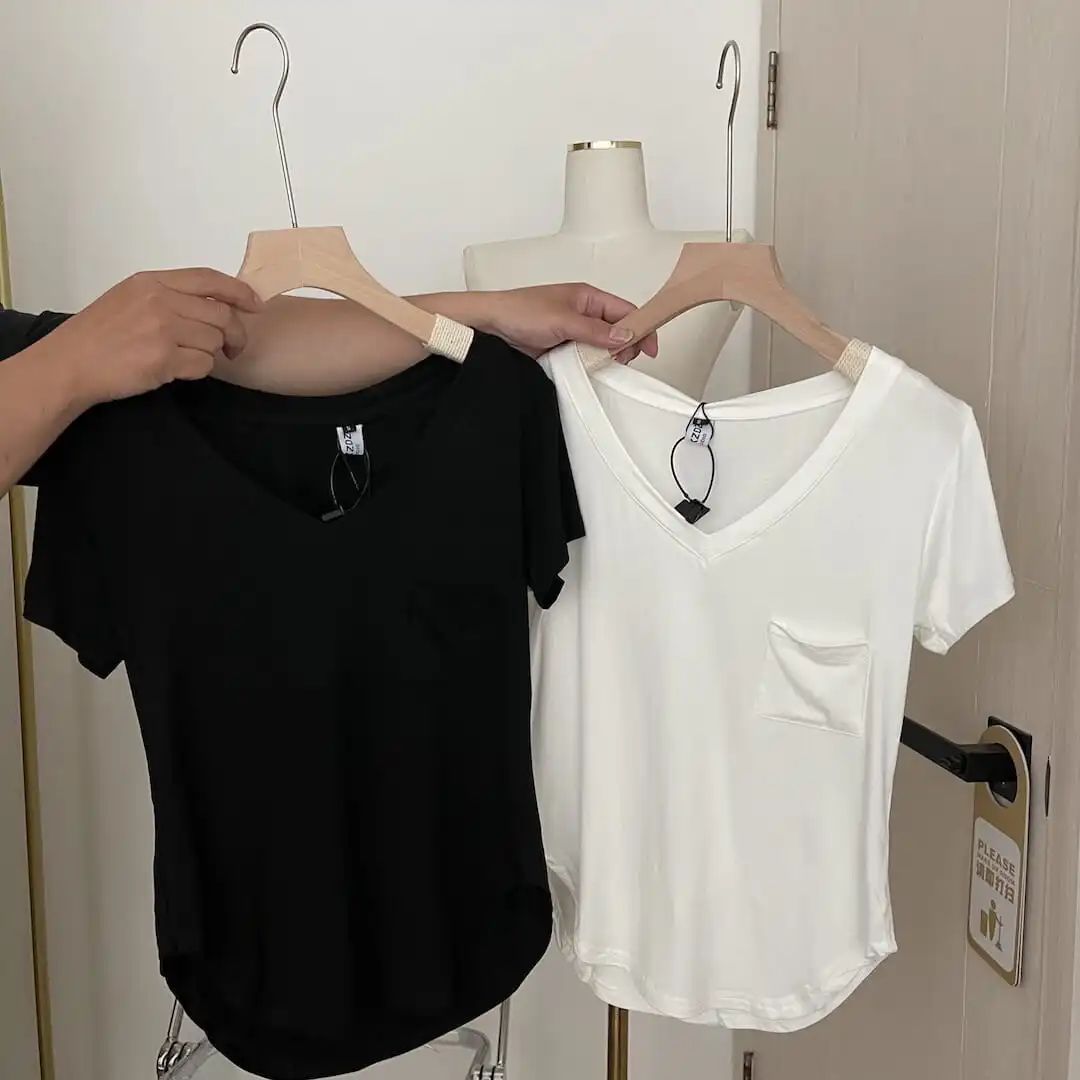 莫代尔棉垂坠感锁骨T恤女夏季宽松韩版打底衫短袖休闲v领上衣