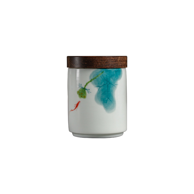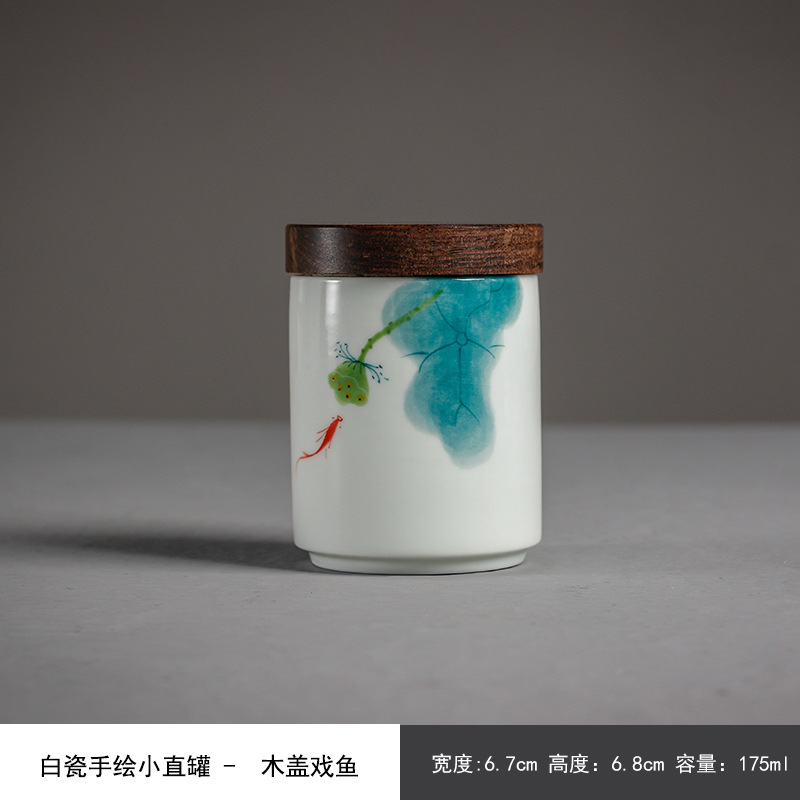 纯手绘戏鱼木盖迷你小茶叶罐家用陶瓷密封罐便携式茶仓储存罐空罐