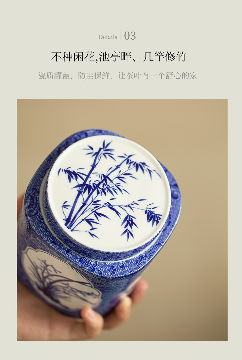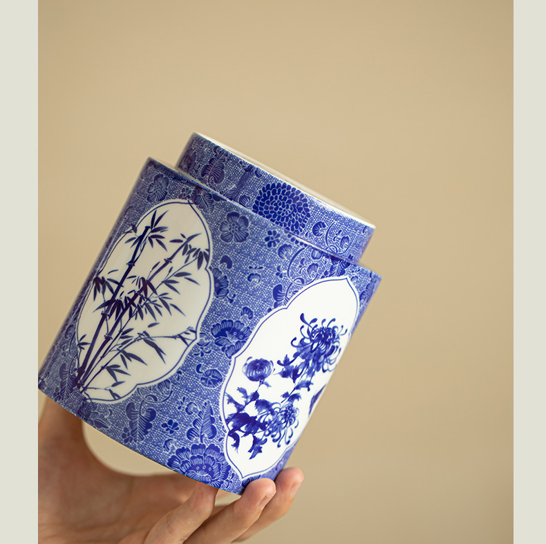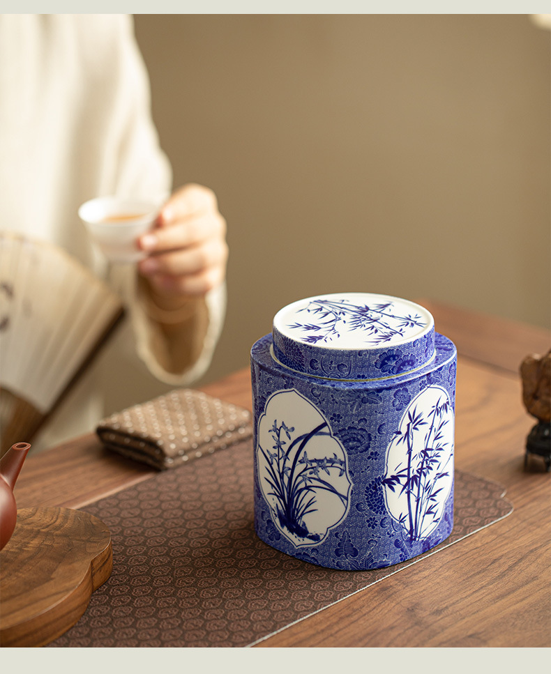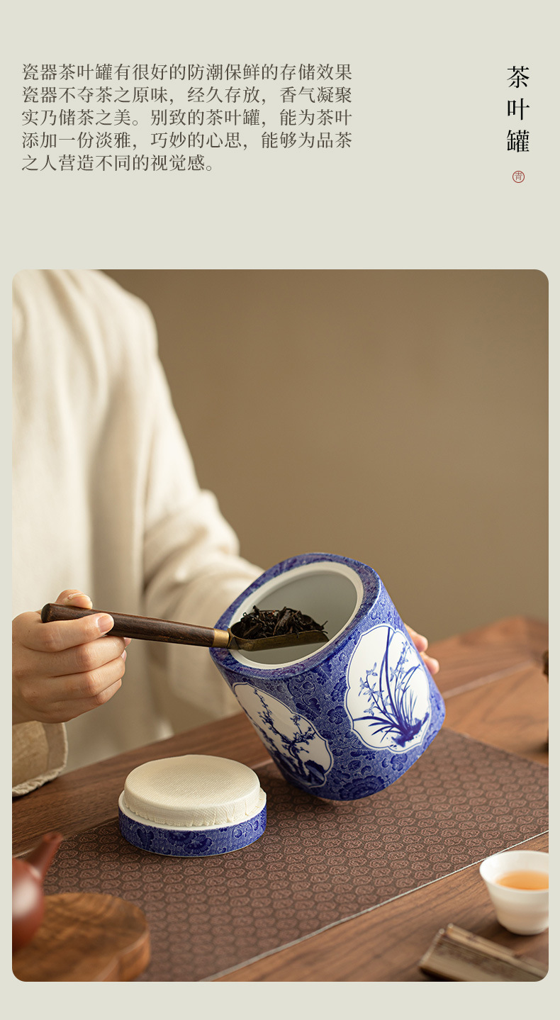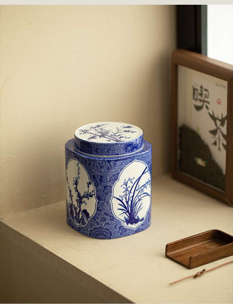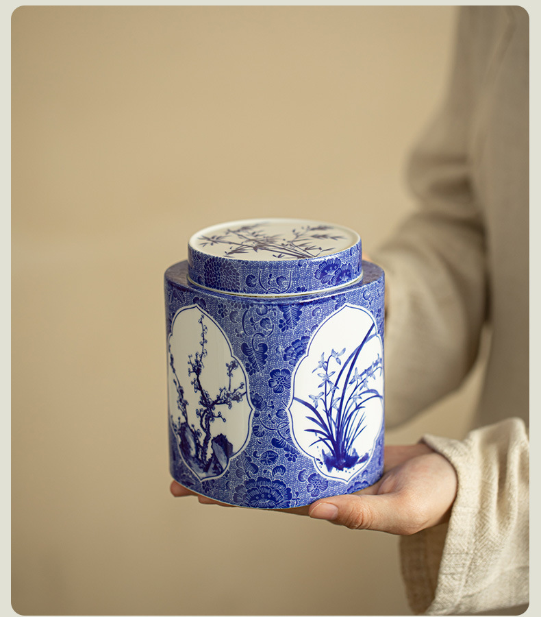 仿古青花-四方圆-梅兰竹菊茶叶罐