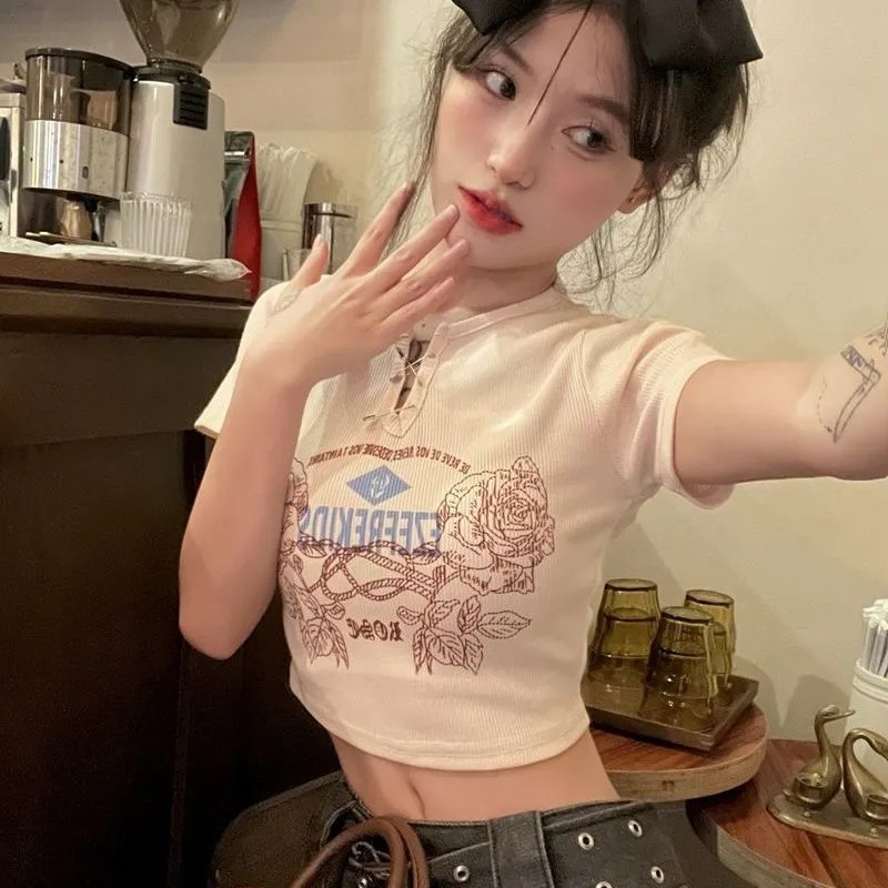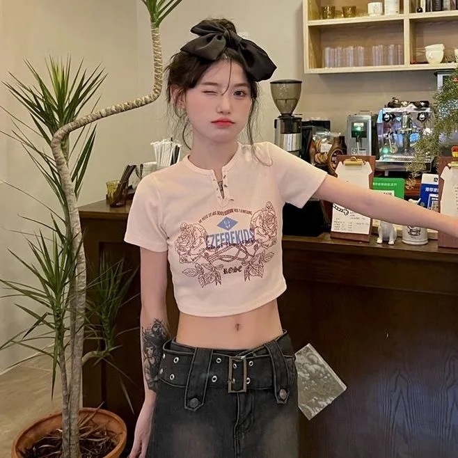 甜辣少女复古印花短袖t恤女韩版ins夏季设计感显瘦露脐短款上衣潮