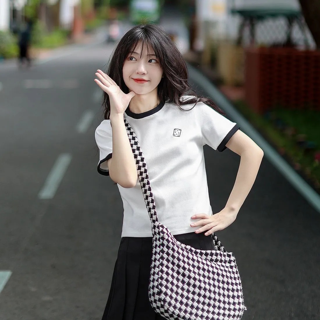 撞色边小饼干刺绣冰丝螺纹短袖T恤女ins夏季宽松休闲正肩显瘦上衣