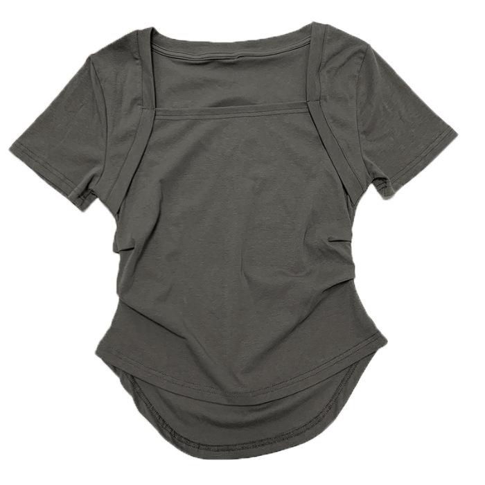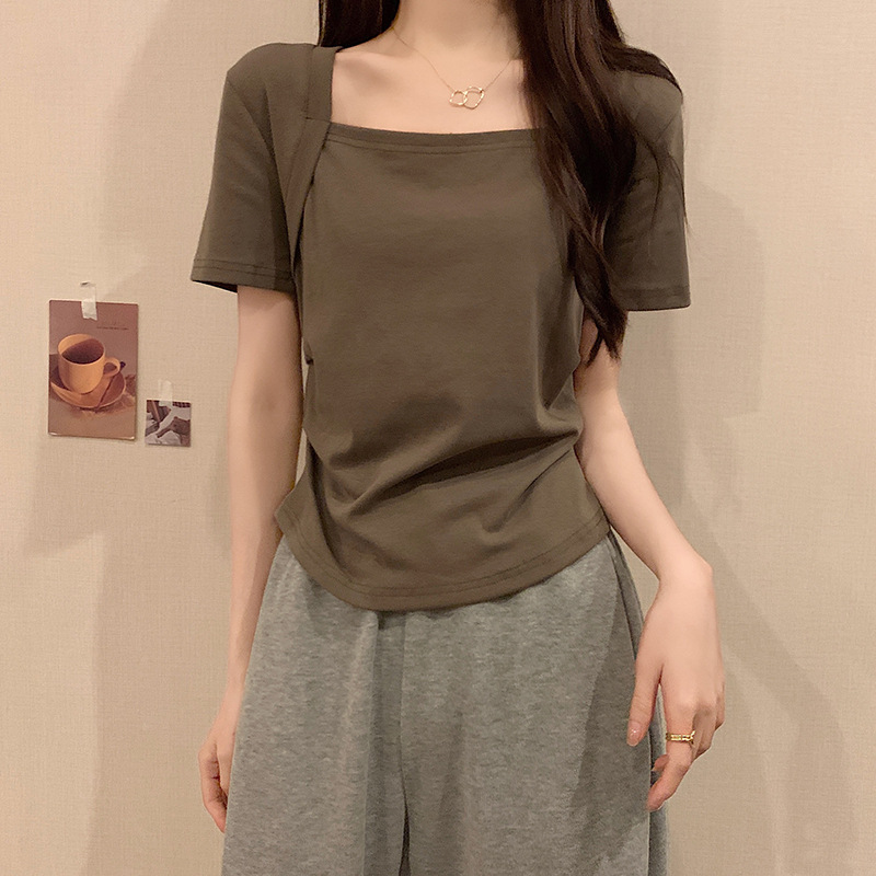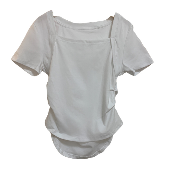 夏季方领辣妹短袖显瘦遮肉T恤女小众设计感别致不规则短款上衣ins