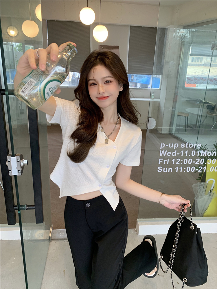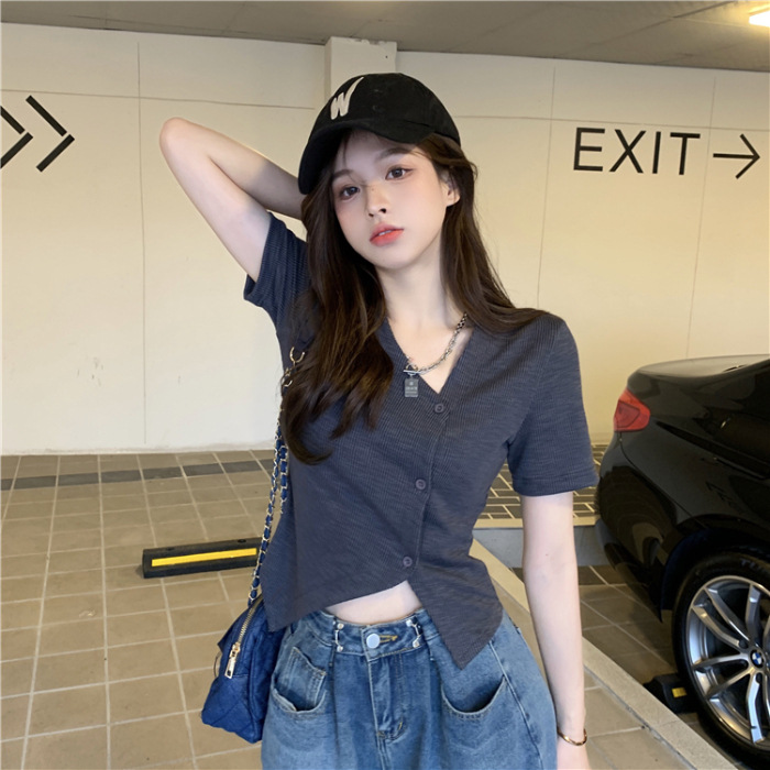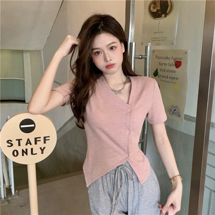 小众设计感不规则别致V领T恤女夏季新款甜辣妹修身显瘦短袖开衫潮