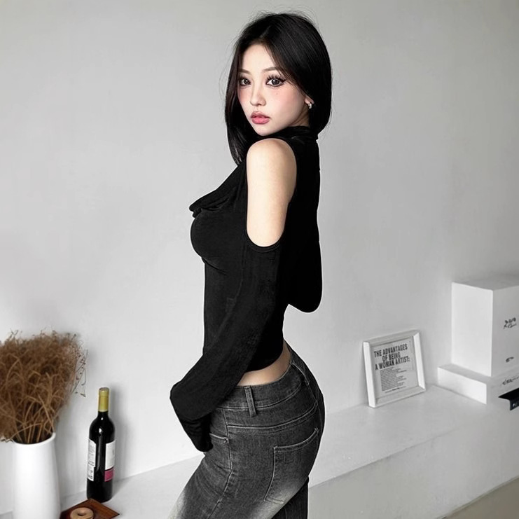 辣妹露肩V领镂空修身百搭长袖T恤女2025早秋季新款黑色显瘦上衣潮