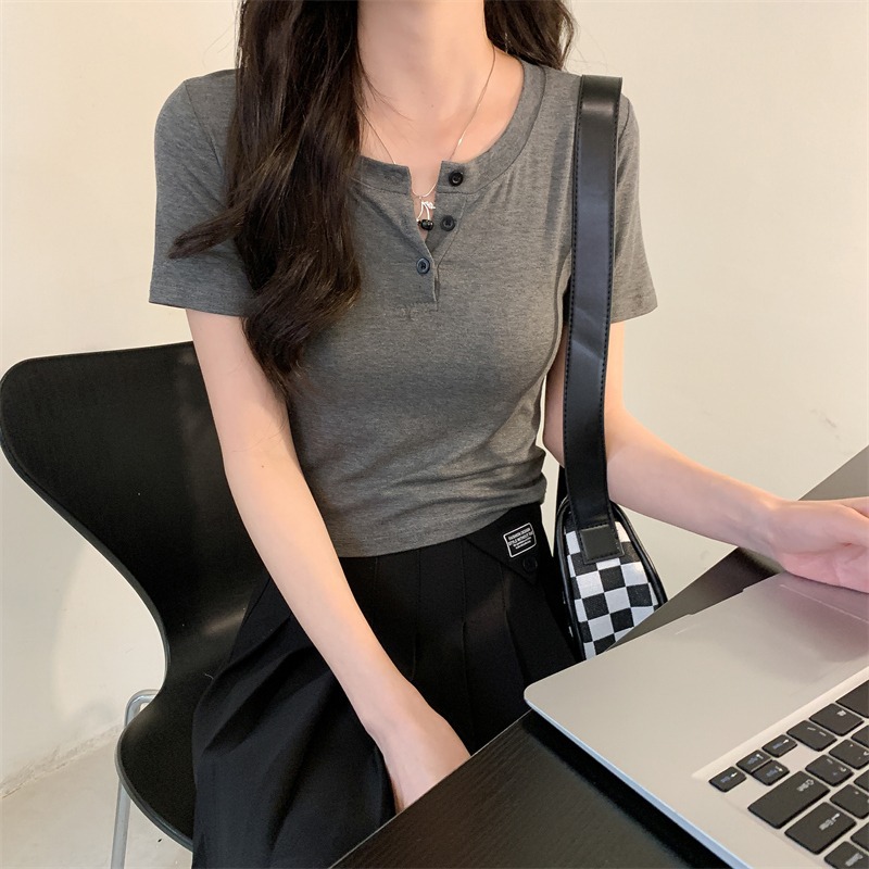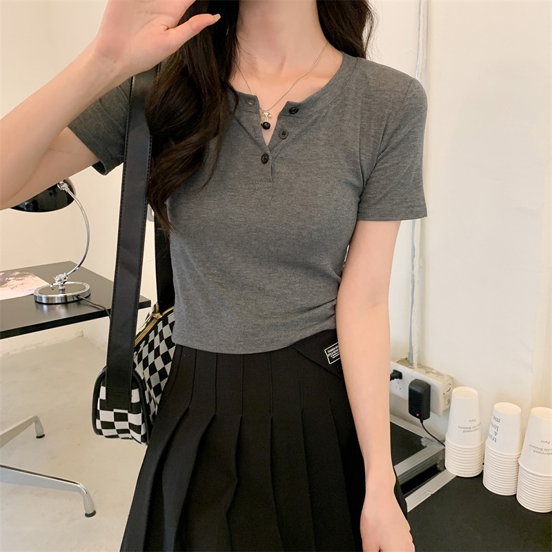 纯棉polo领撞色正肩t恤女款修身辣妹设计感短款V领显瘦韩式上衣夏