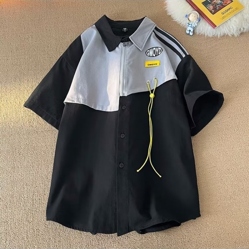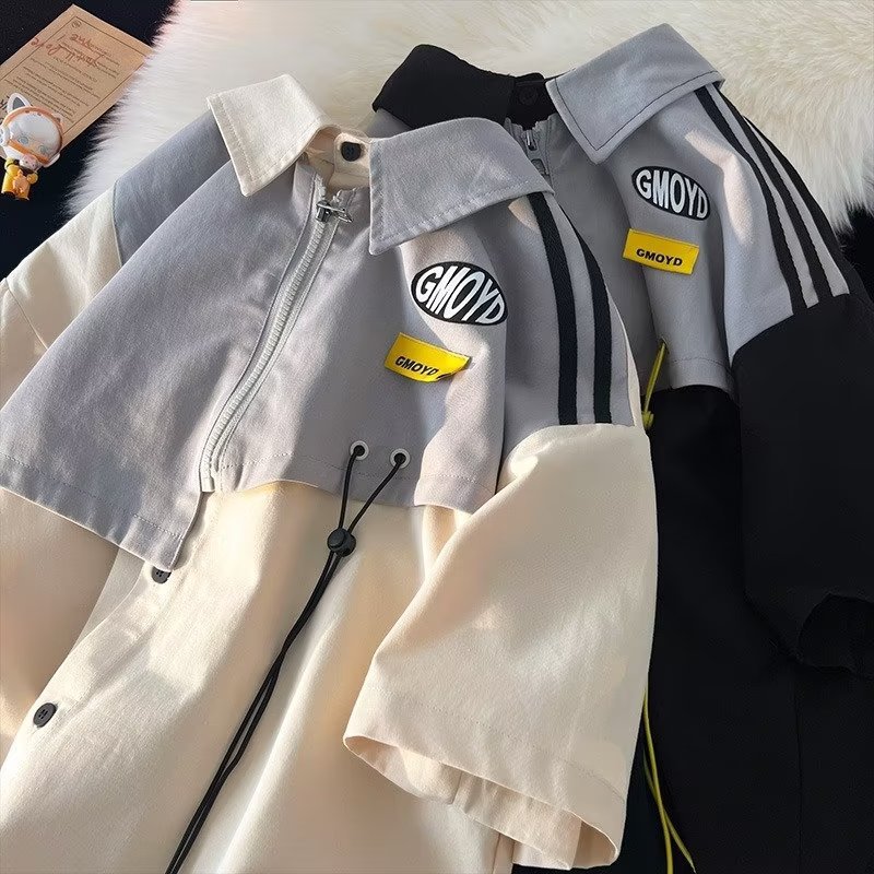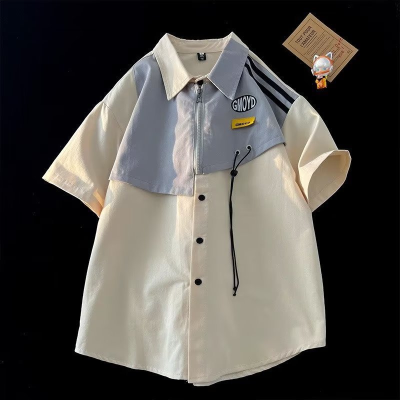 假两件短袖衬衫男生潮牌潮流夏季设计感衬衣休闲宽松美式复古外套