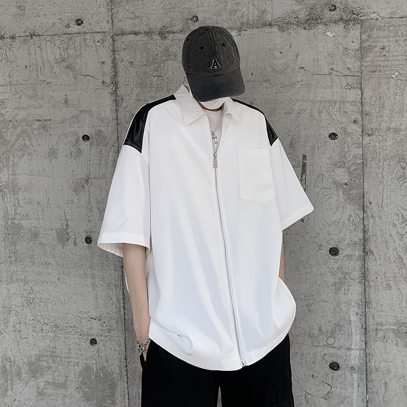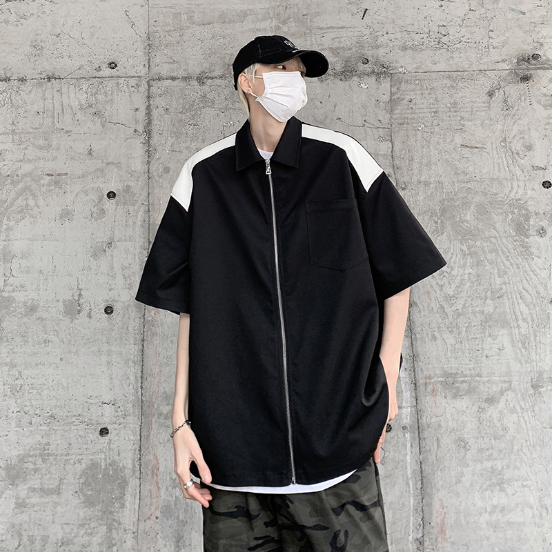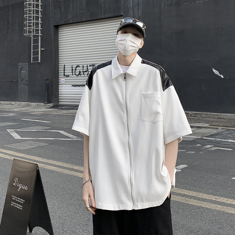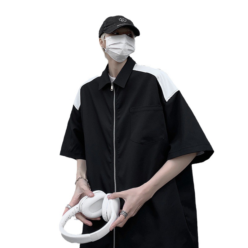 半袖衬衫男夏季小众设计感撞色短袖衬衣美式高街潮牌宽松休闲外套