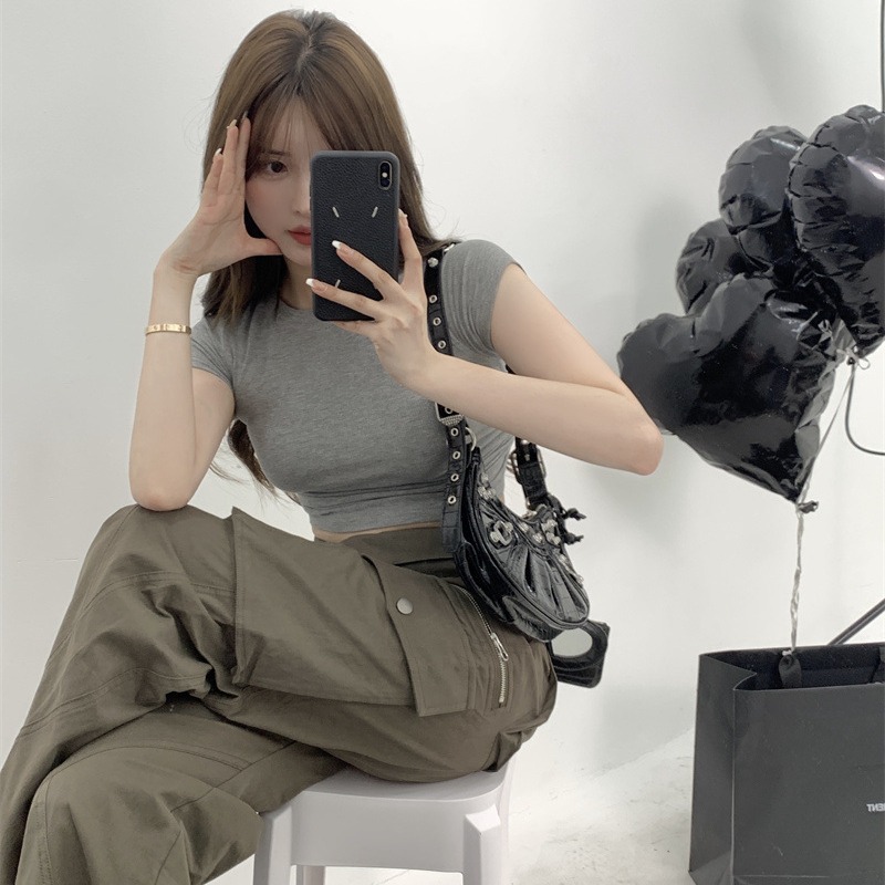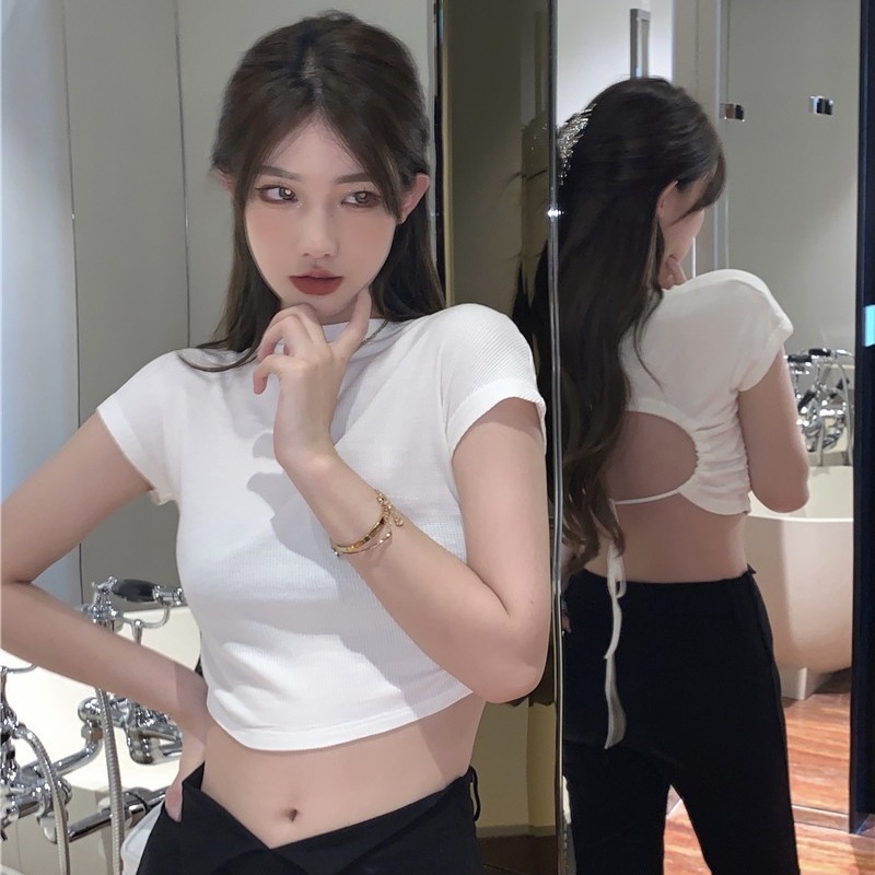 纯欲辣妹抽绳绑带性感短袖T恤女露背设计感独特别致短款紧身上衣