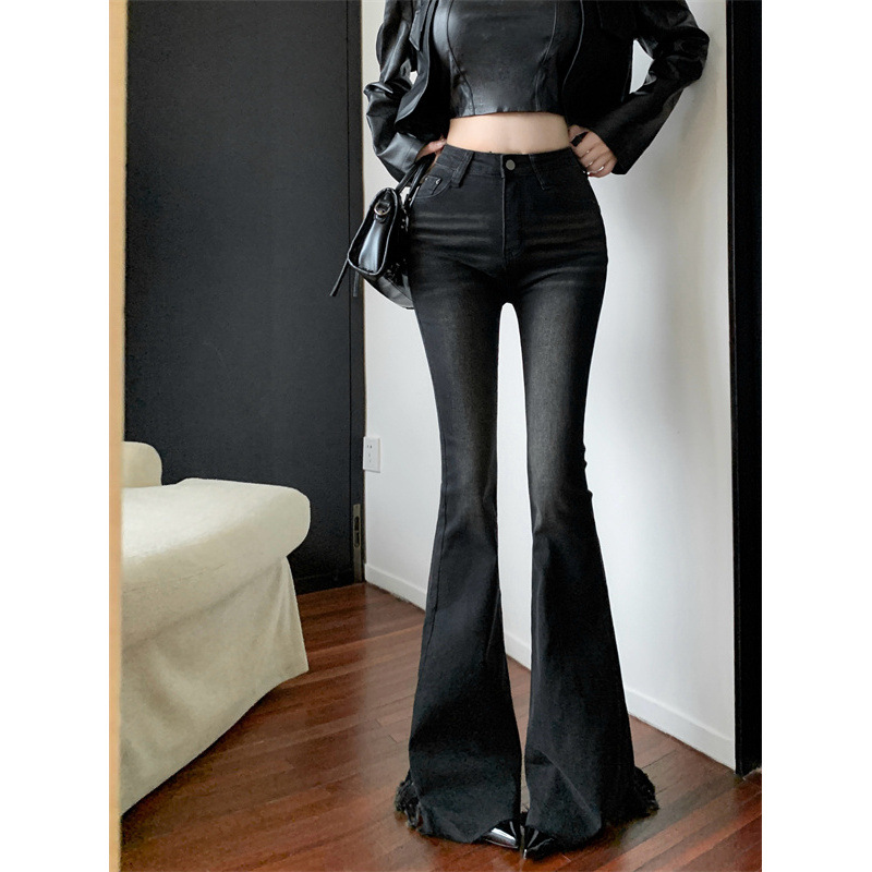 美式辣妹黑色水洗复古拉链设计牛仔显瘦高腰修身微喇叭长裤女