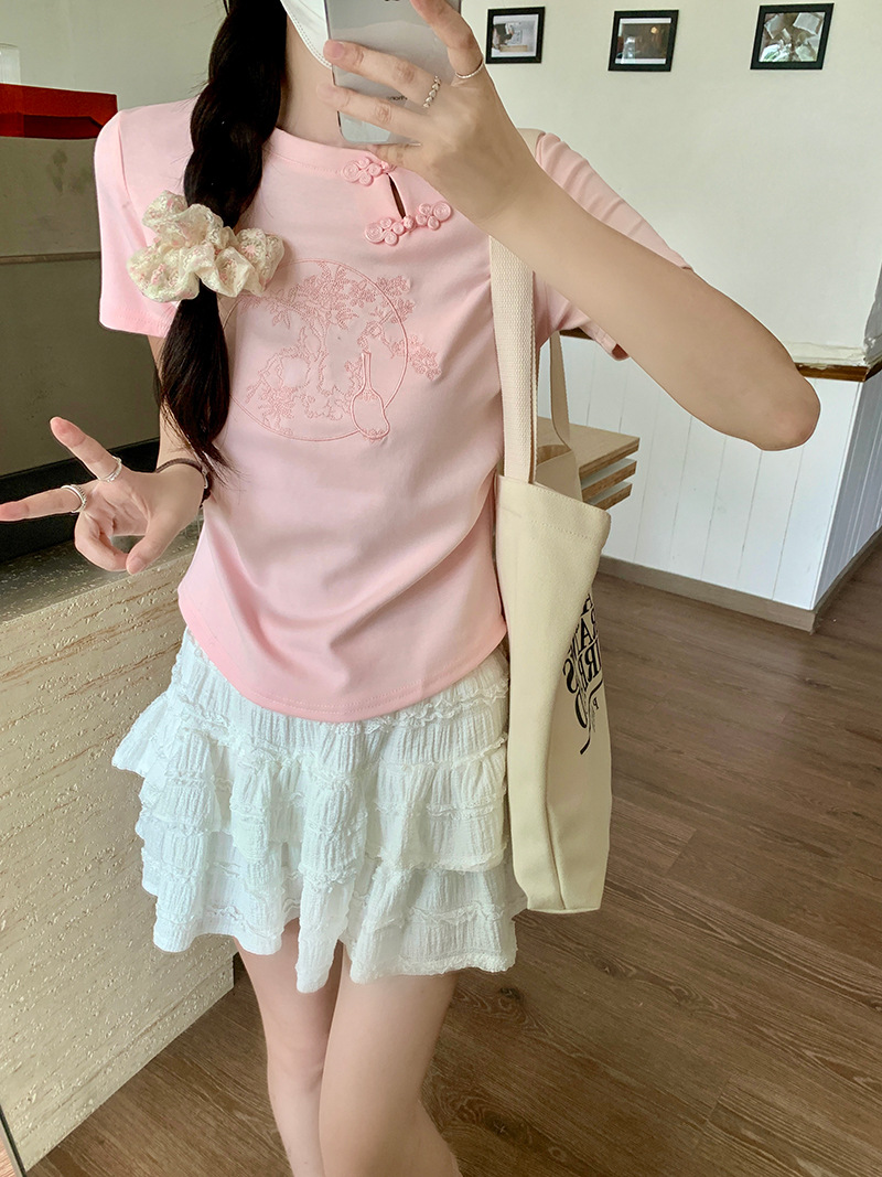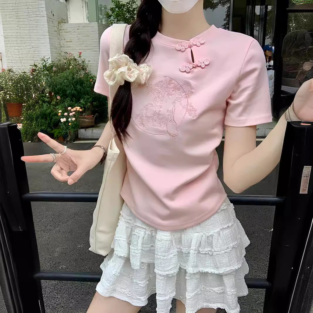 奥巴棉粉色盘扣刺绣复古短袖T恤女爆款2025夏季新中式别致上衣