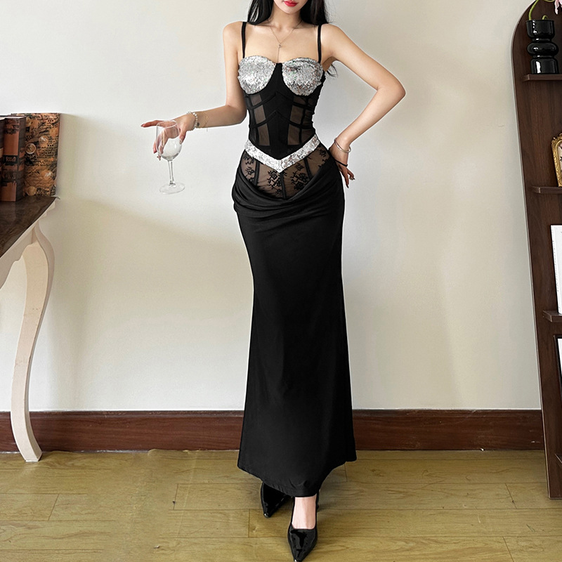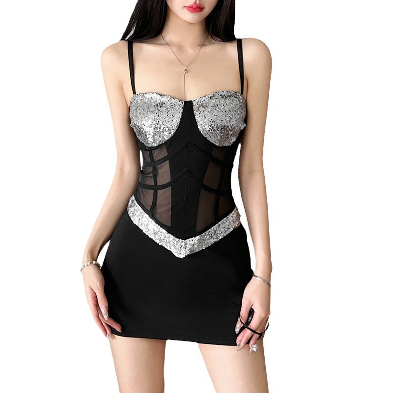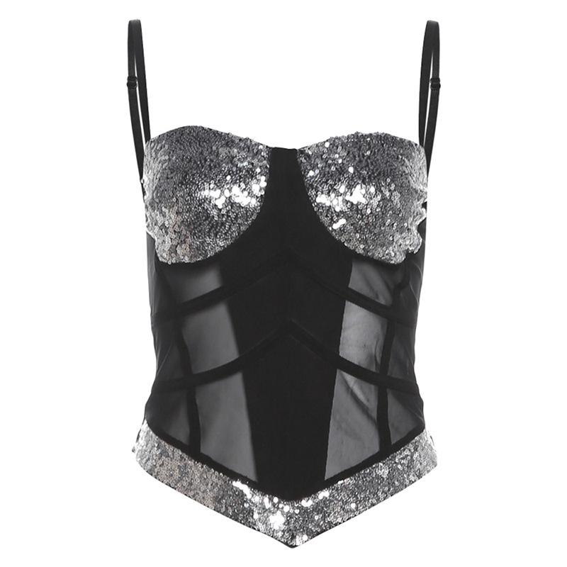 跨境欧美风新款女装撞色拼接银色亮片网纱透视吊带小背心