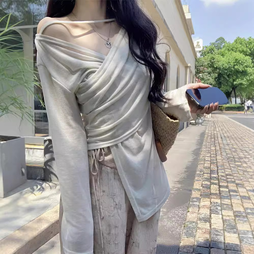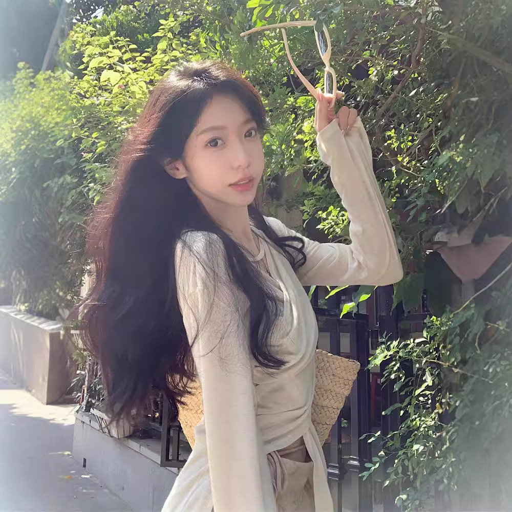 设计感小众V领不规则交叉长袖T恤女春季2025新款杏色修身防晒上衣