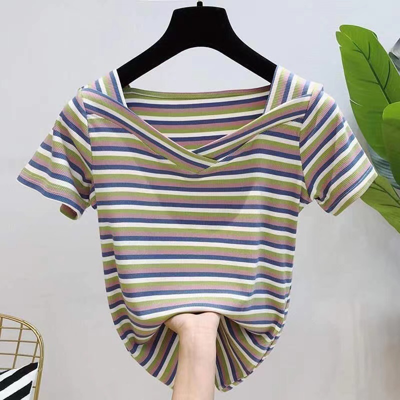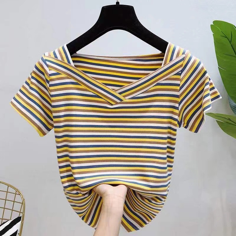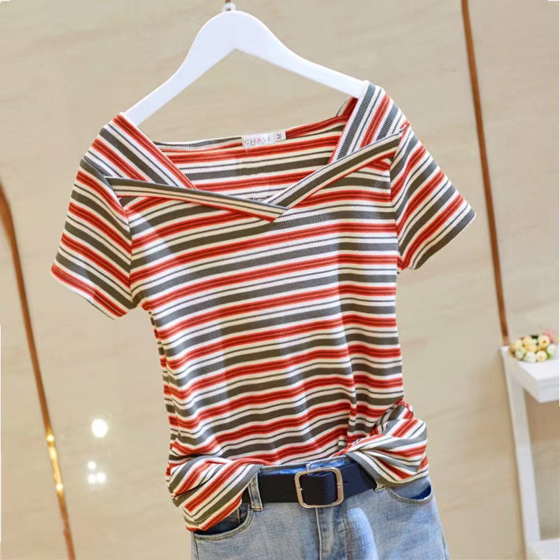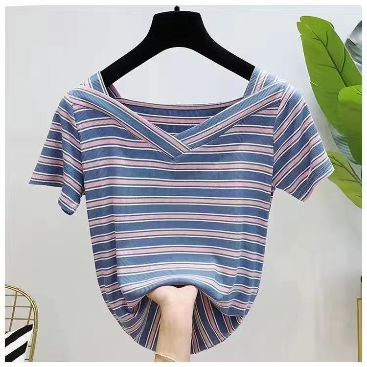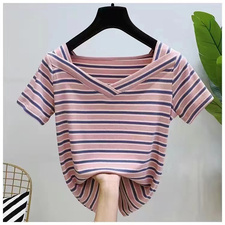 纯棉条纹v领短袖t恤女夏季新款宽松显瘦大码百搭体恤衫上衣潮