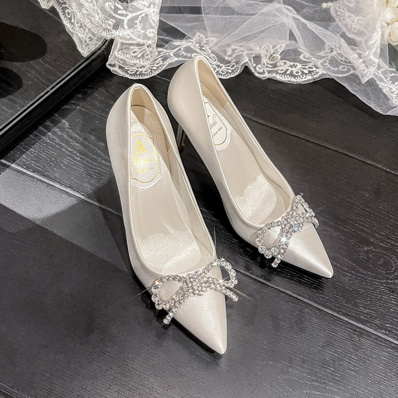 缎面主婚纱水钻蝴蝶结新娘鞋法式白色小众高级感高跟鞋大码婚礼鞋