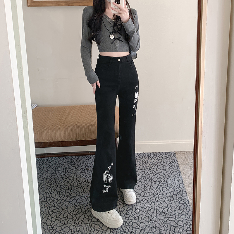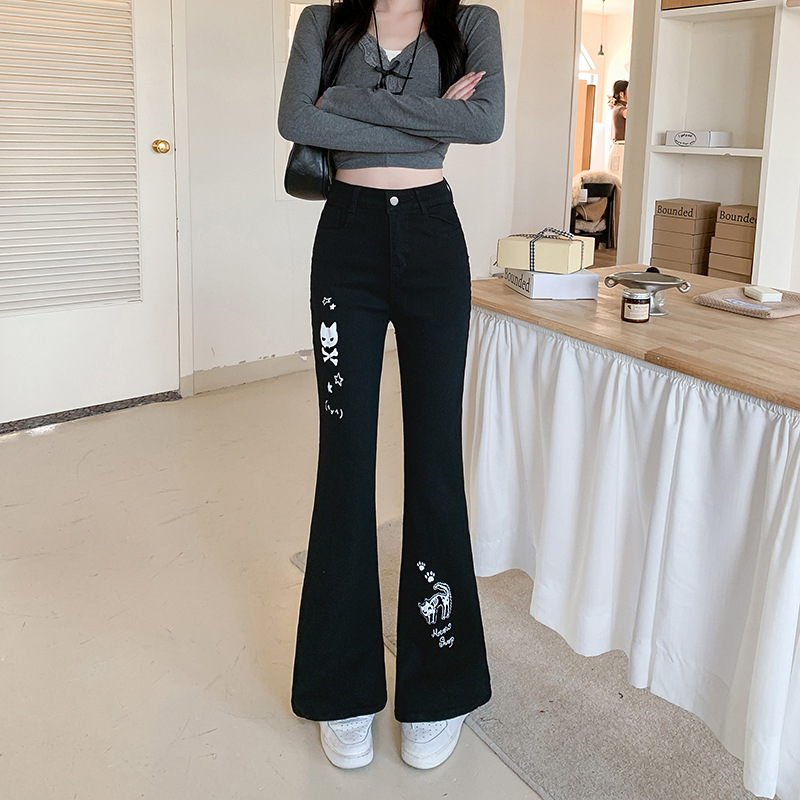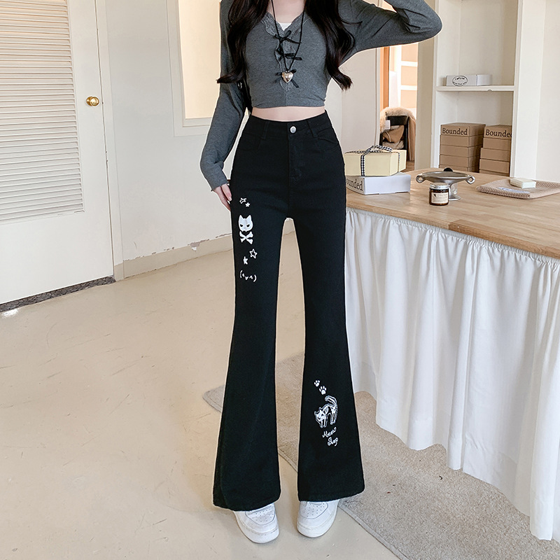 实拍实价~设计感骷髅猫印花微喇牛仔裤女新款高腰显瘦阔腿长裤子