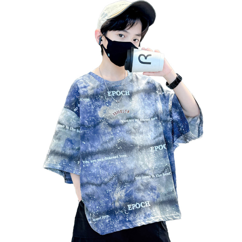 儿童装男童夏装T恤前后印花扎染新款中大童夏季短袖潮范圆领上衣