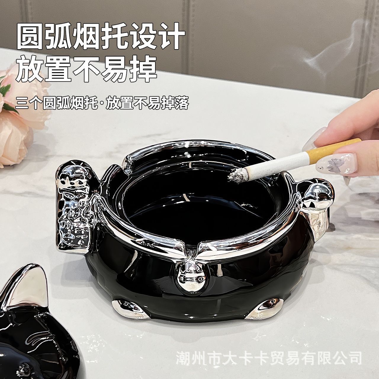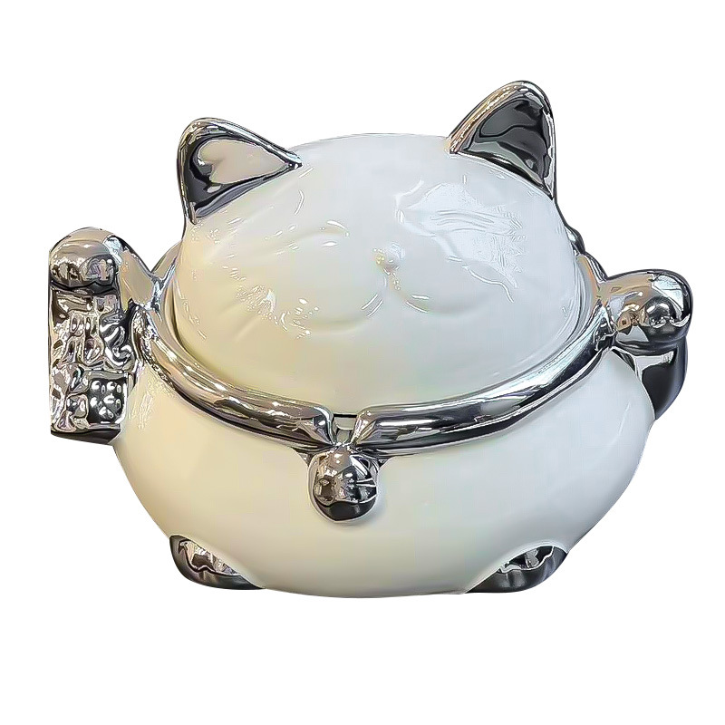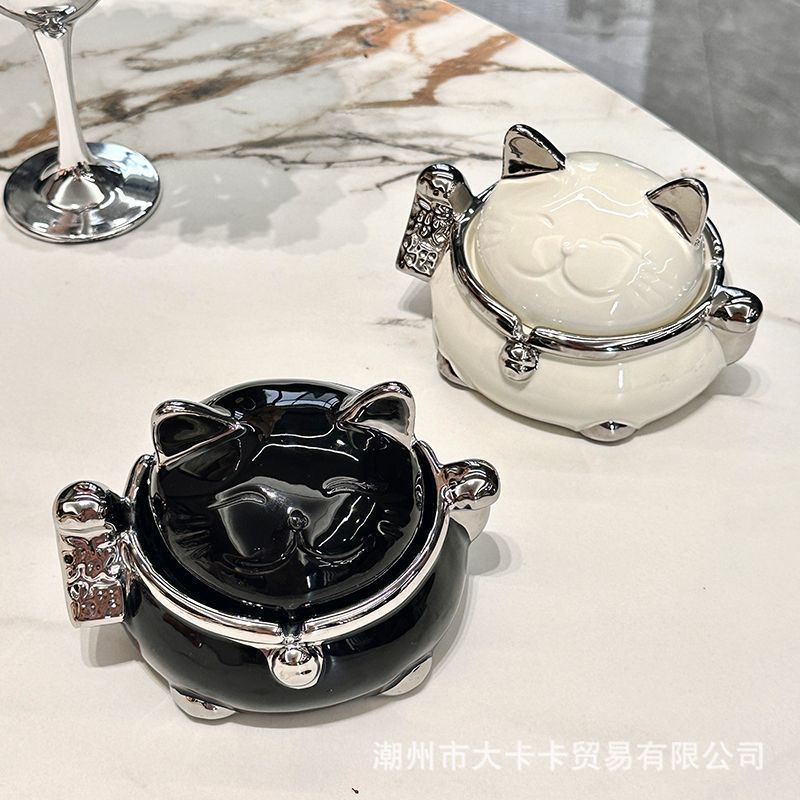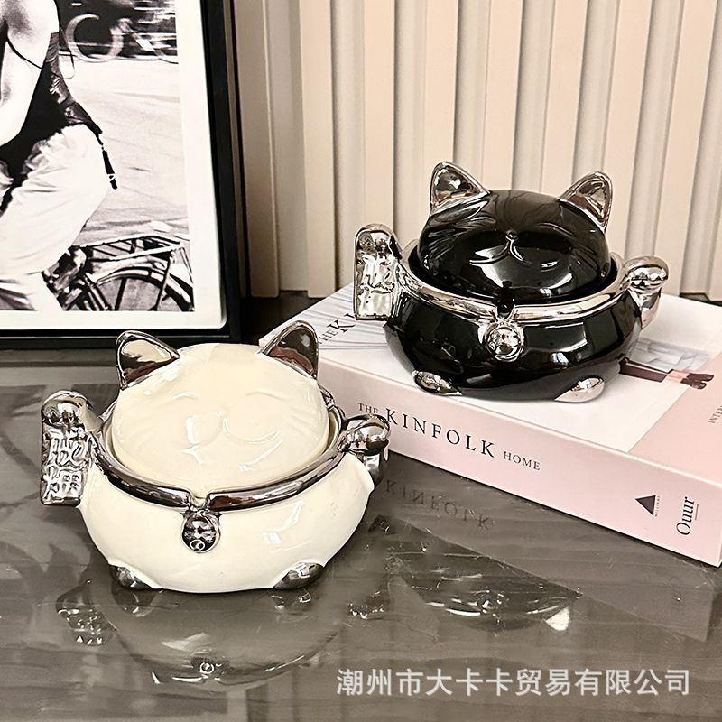 轻奢家用招财猫烟灰缸高级感带盖防飞灰陶瓷烟灰缸客厅创意摆件