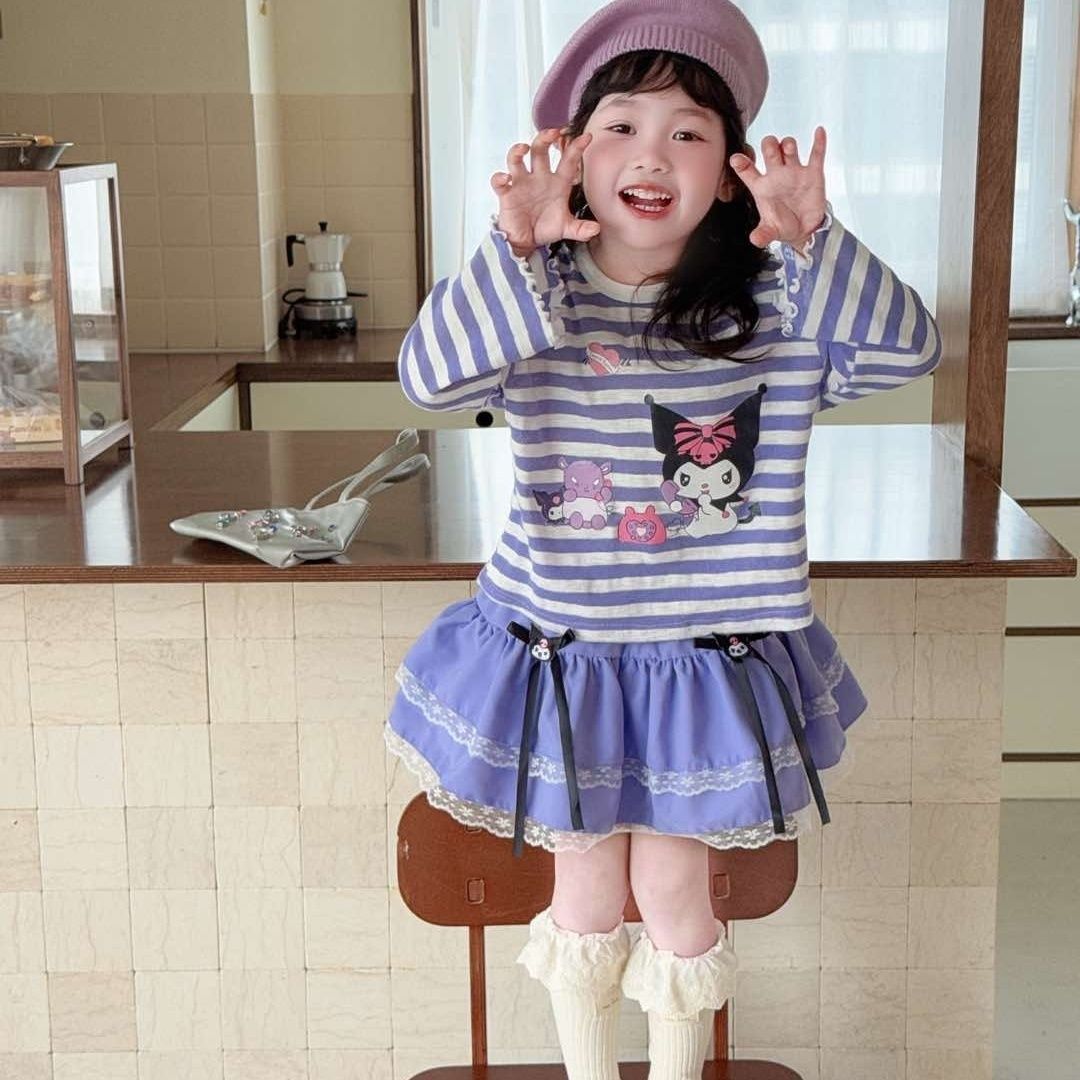 2025春夏新款女童库洛米甜美百搭条纹长袖T恤蝴蝶结三丽鸥蓬蓬裙