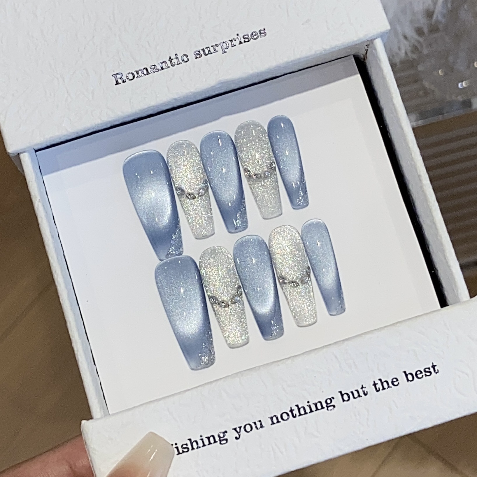 一只顾美甲 冰透冰川蓝微笑猫眼马眼银碎细闪蓝丝带贴片穿戴甲
