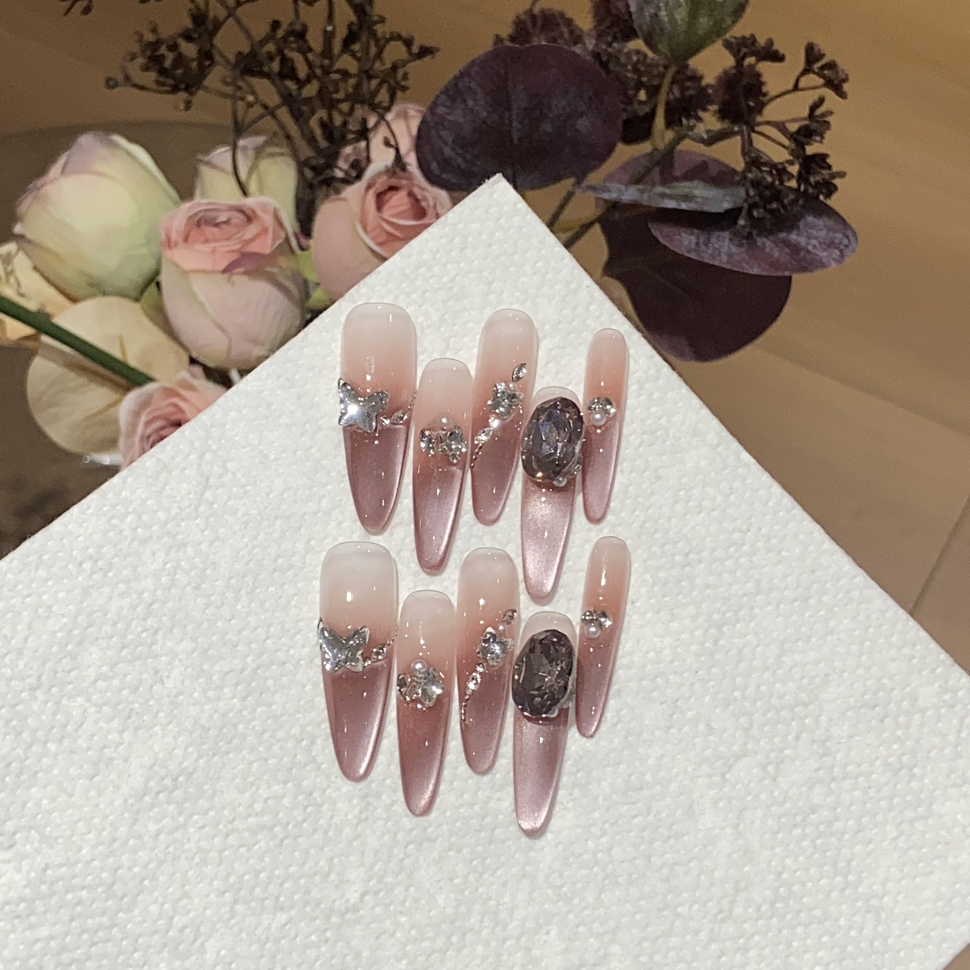 一只顾美甲 纯欲粉色渐变侧光猫眼斜边碎钻K9椭圆钻九紫离火甲片