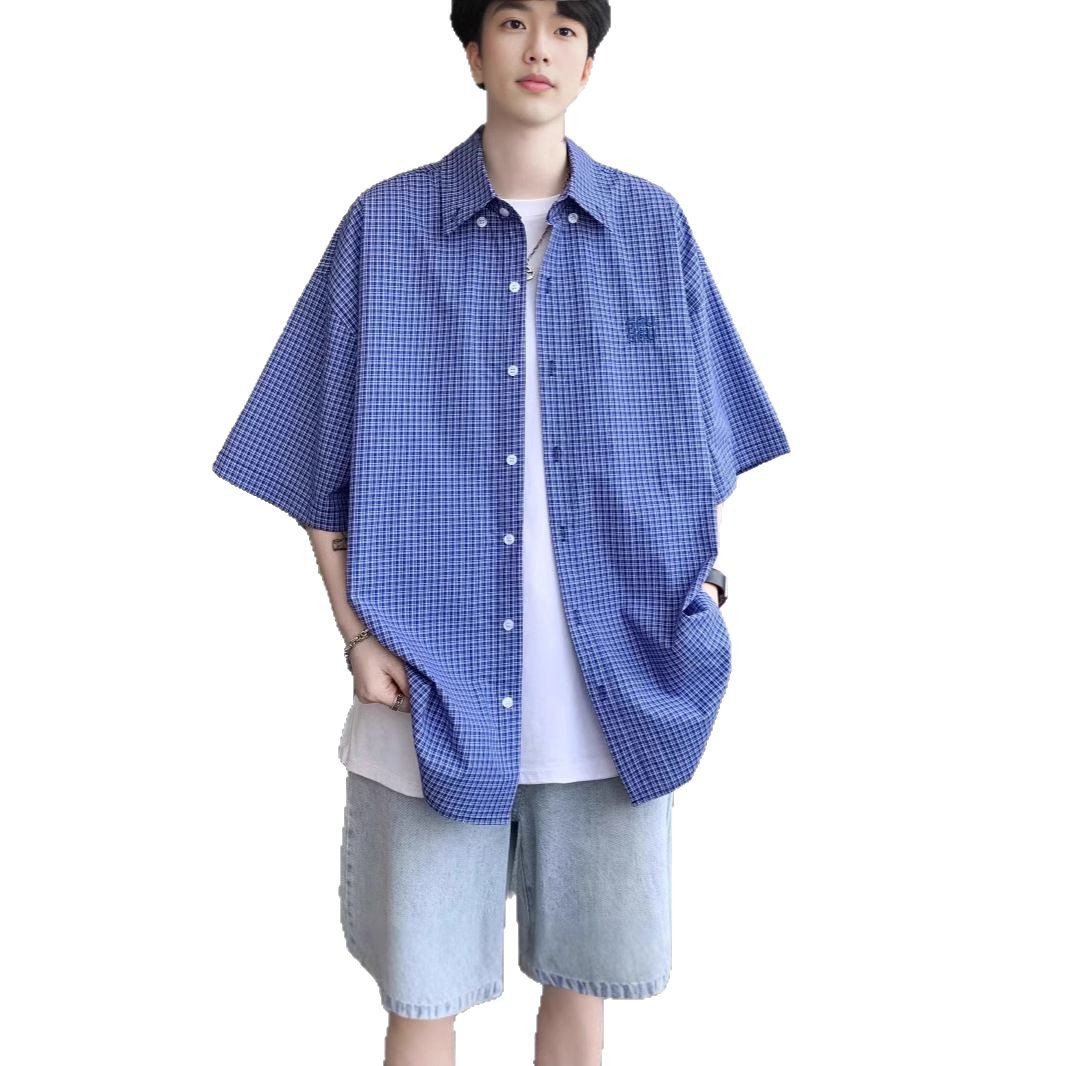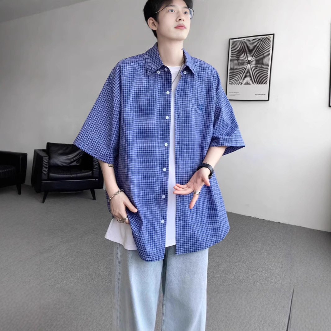 复古蓝色格子短袖衬衫男夏季韩版宽松高级感刺绣短袖格纹衬衣外套