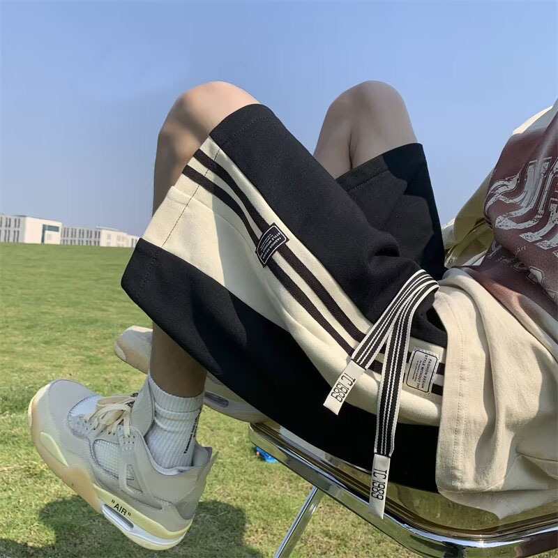 美式贴标五分短裤男士夏季潮牌复古条纹青少年直筒宽松休闲运动裤