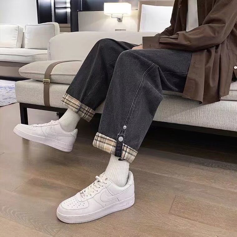 春秋新款牛仔裤男士复古百搭宽松直筒阔腿裤港风潮牌痞帅卷边裤子
