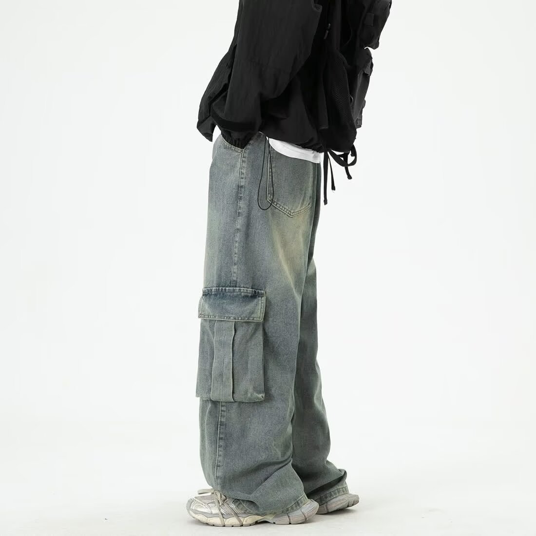 阔腿工装牛仔裤男春夏季潮牌大口袋宽松裤子水洗复古高街拖地长裤