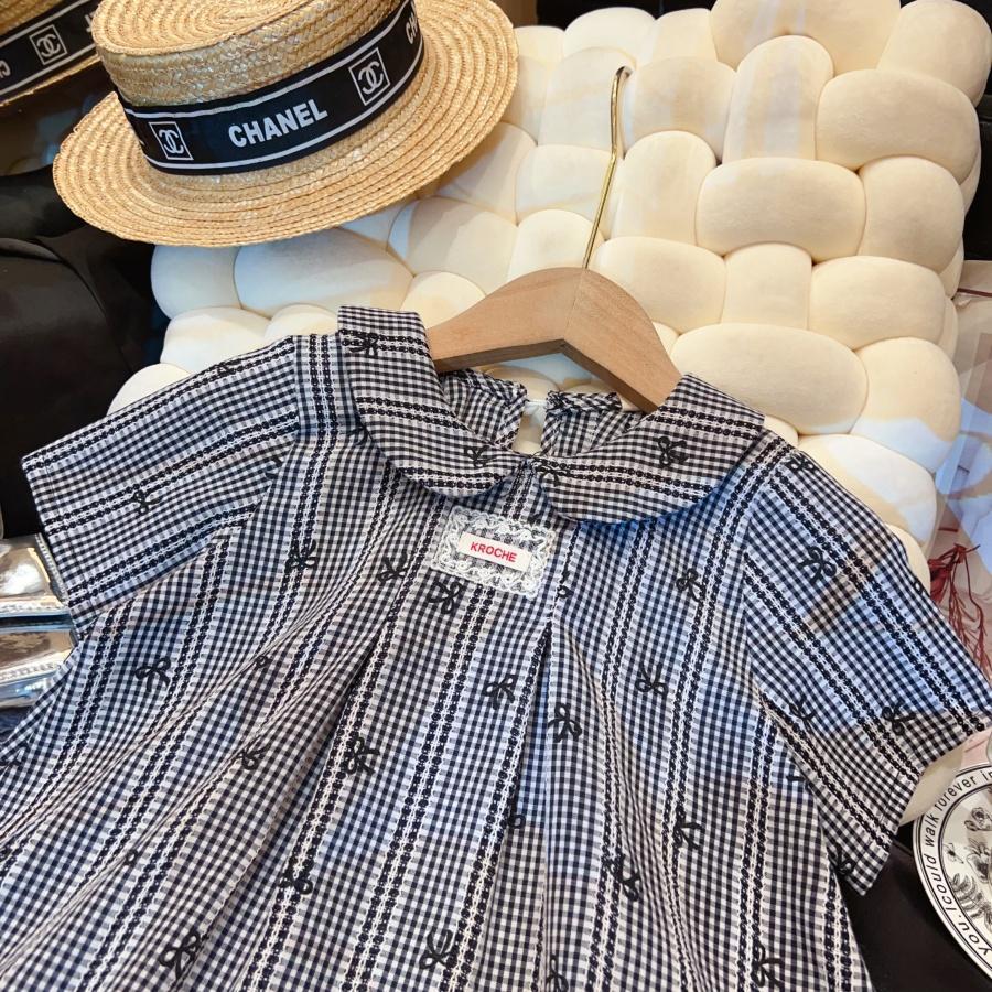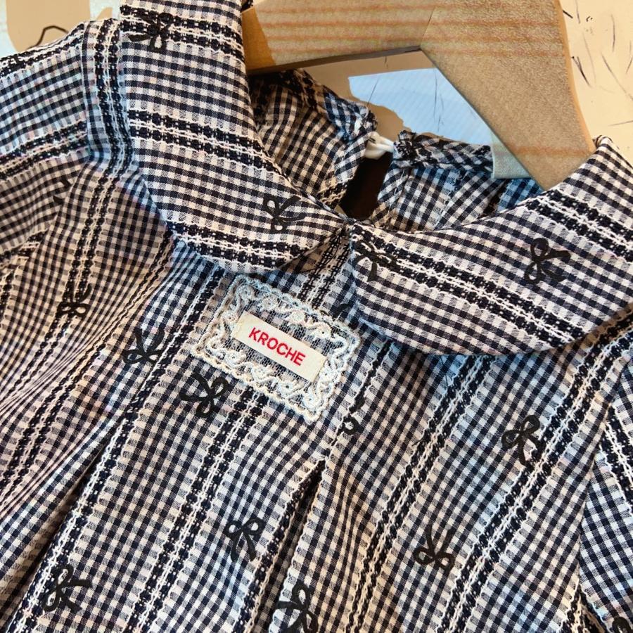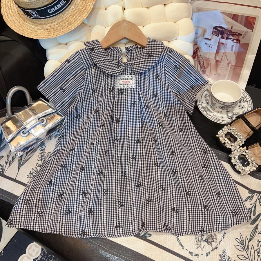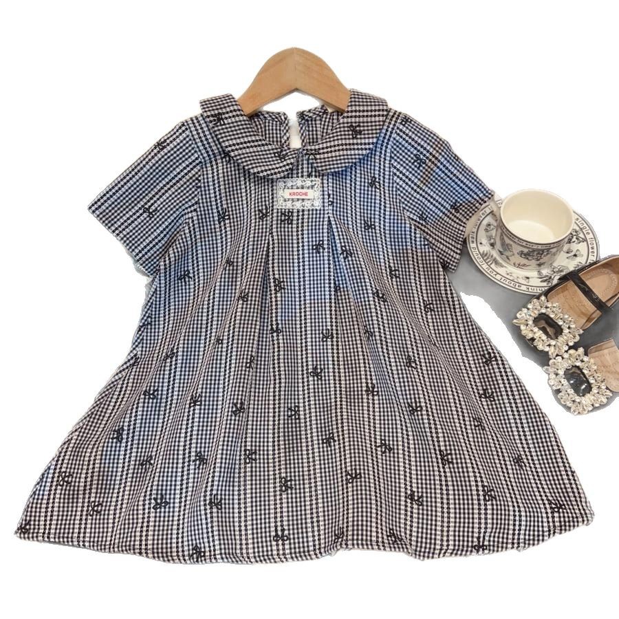 2025女童夏季新款韩版森系娃娃领蝴蝶结印花格子新品时尚公主裙