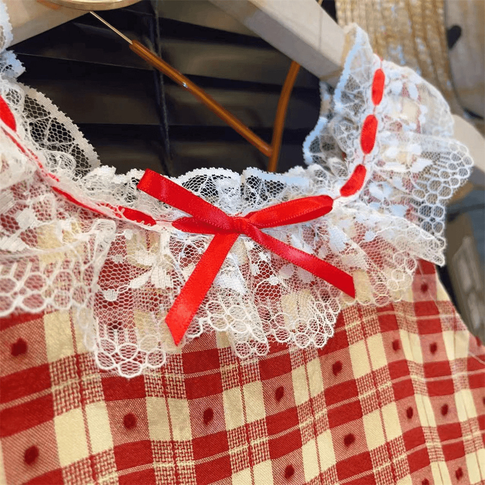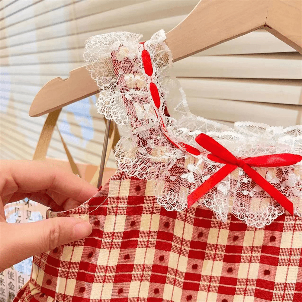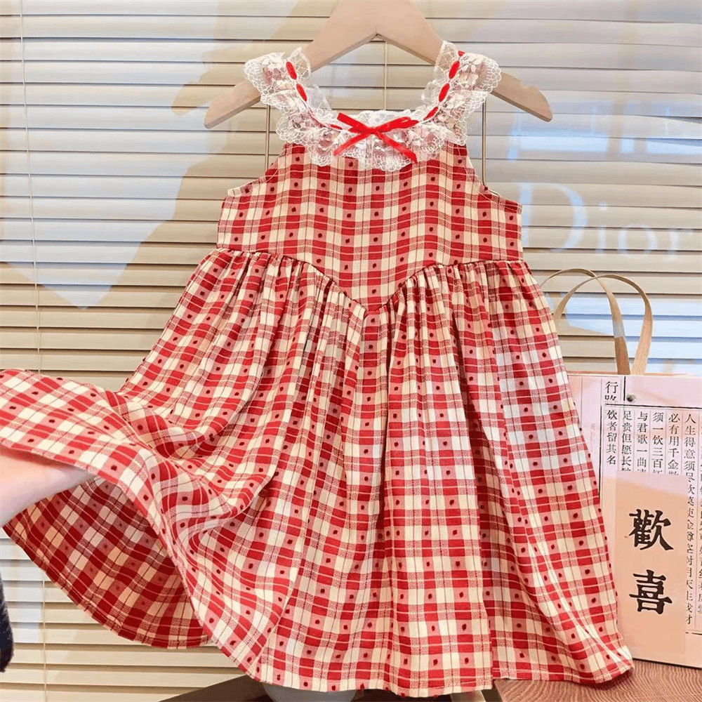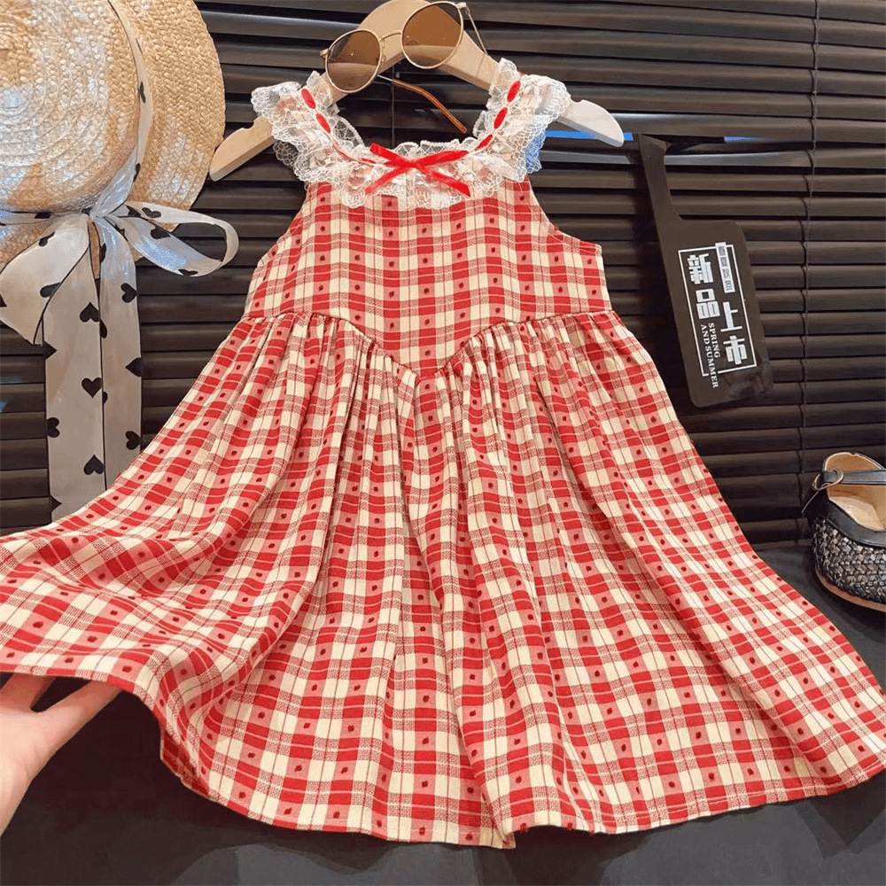 新品女童夏吊带连衣裙2025新款儿童蕾丝领格子无袖连衣裙