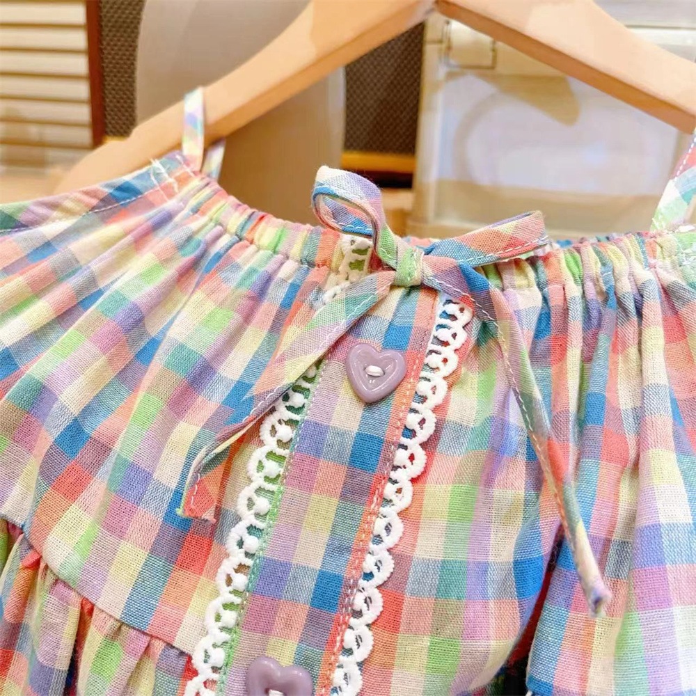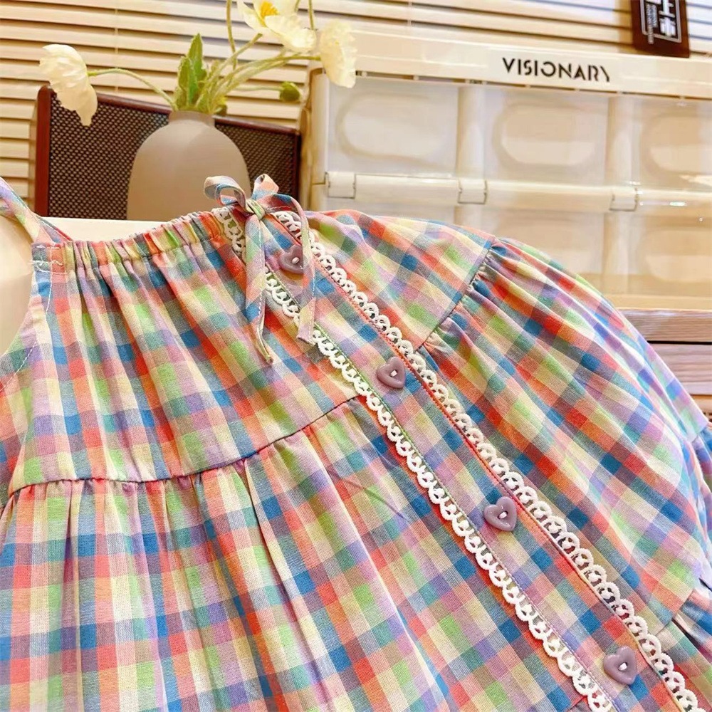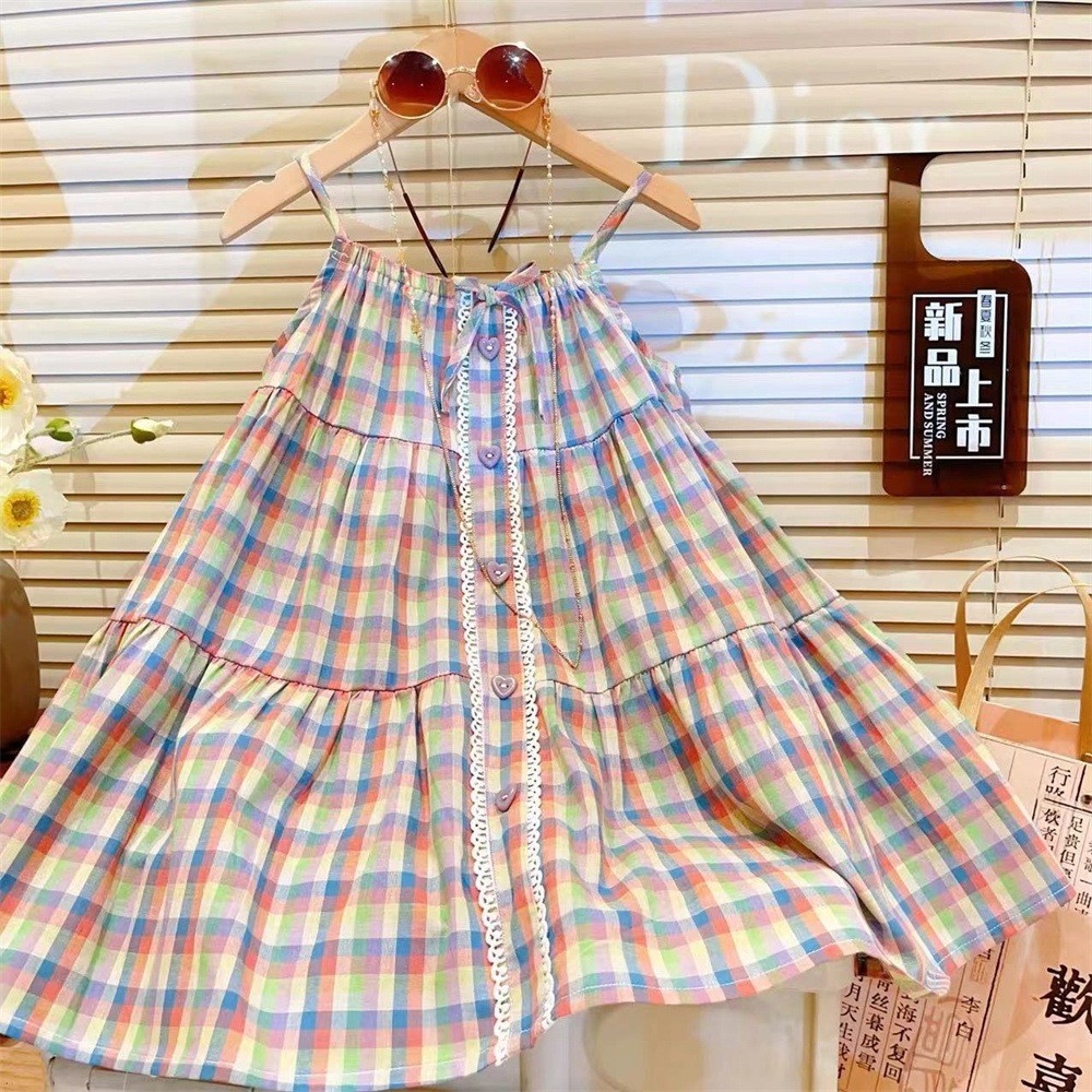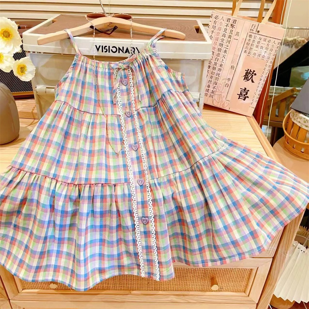 新品彩色格子吊带连衣裙女装夏季宽松海边度假休闲中小童纯棉裙子