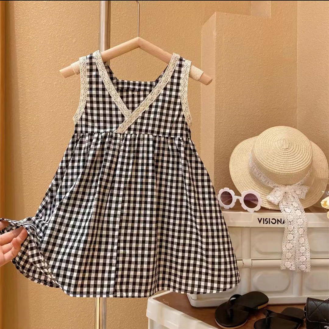 罗马假日女童蕾丝包边甜美黑白格公主背心裙2025夏装新款连衣裙