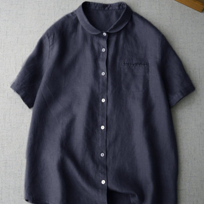 日韩现货纯亚麻衬衫 元宝领短袖上衣棉麻女装 文艺白衬衣女