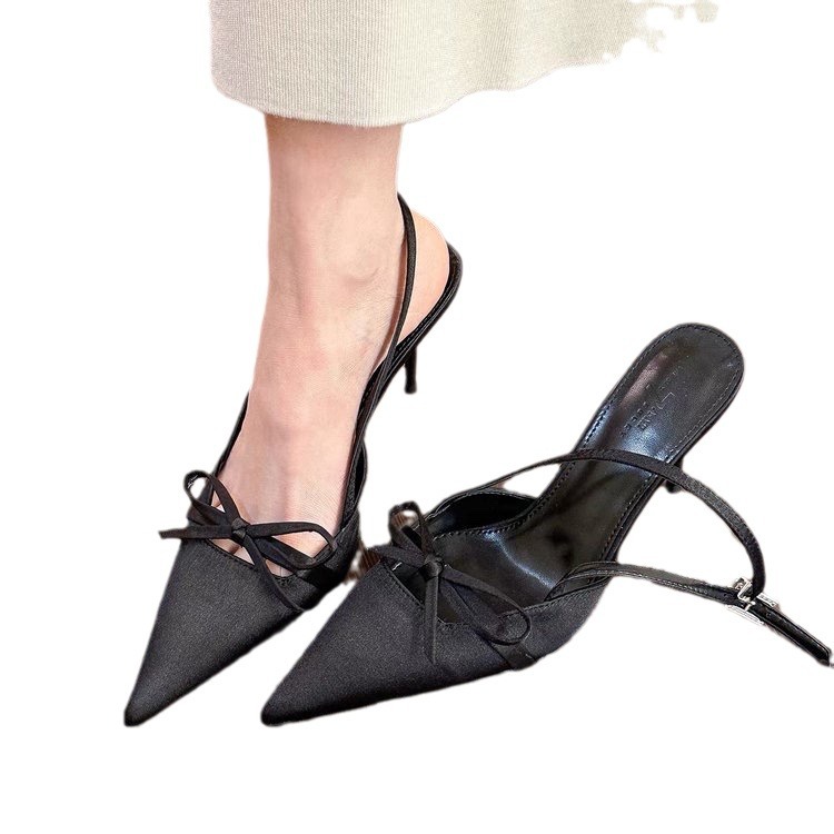 清冷温柔!银色尖头蝴蝶结凉鞋女夏季一字细跟高跟鞋
