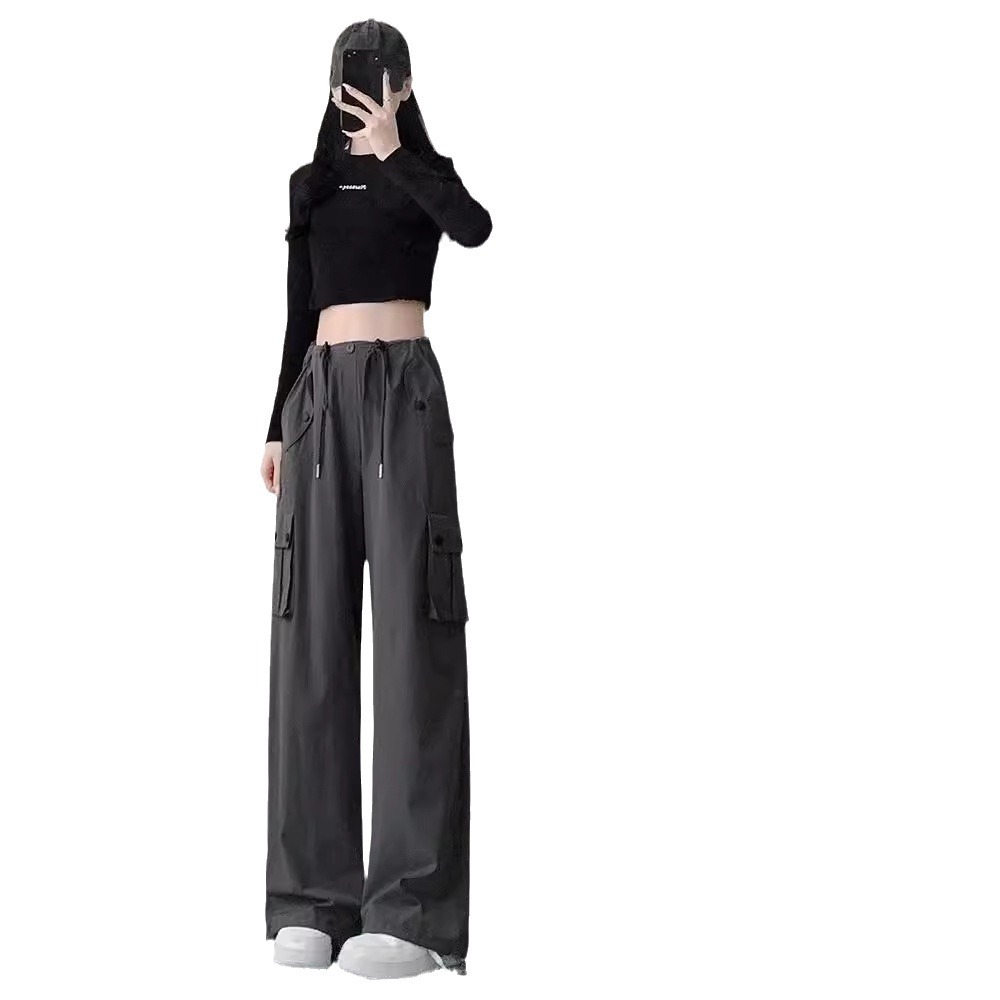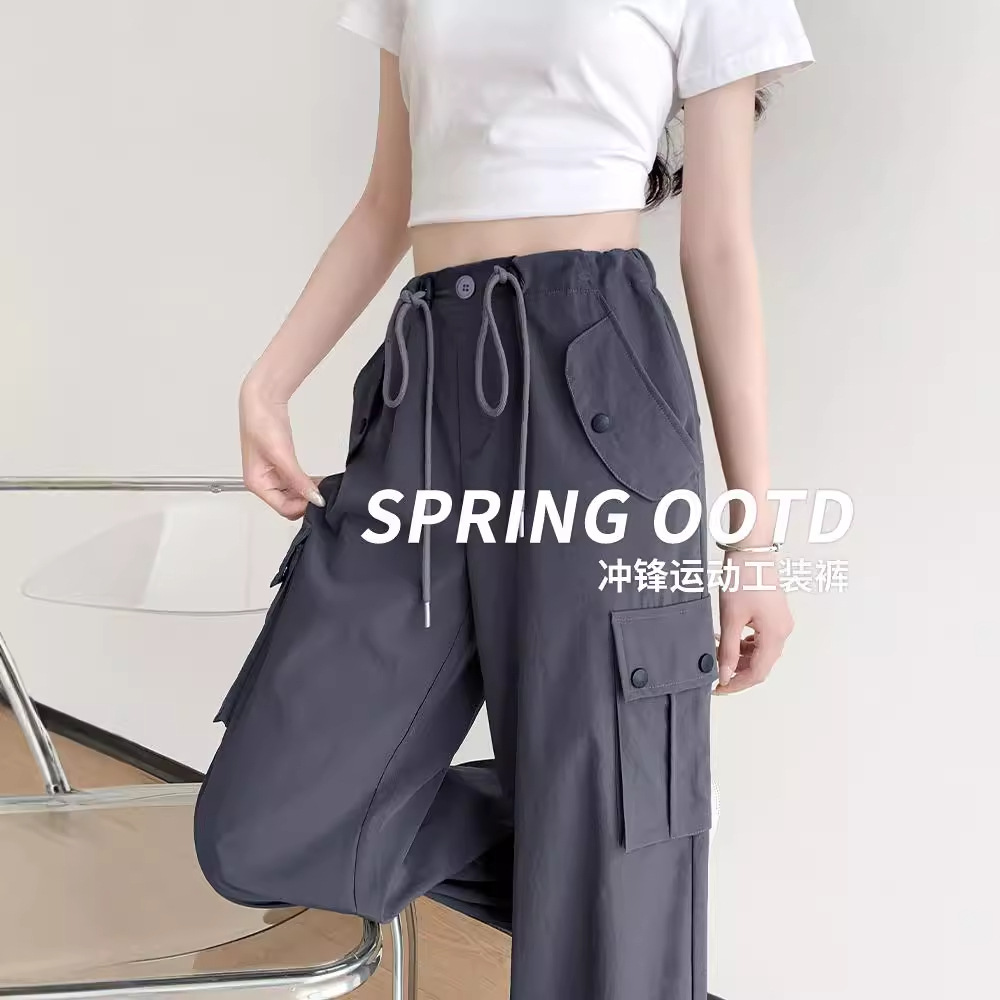 灰色降落伞工装裤子女春秋季2025新款小个子高腰休闲直筒束脚裤夏