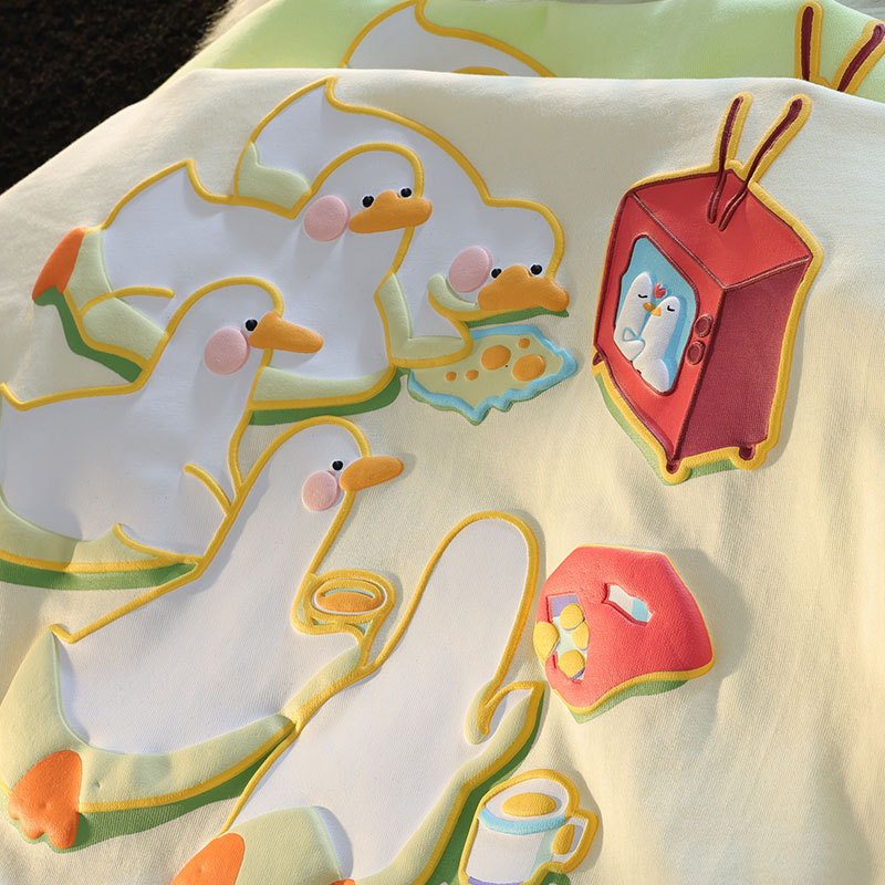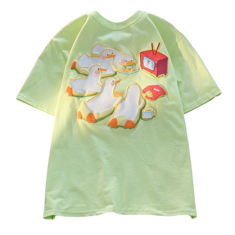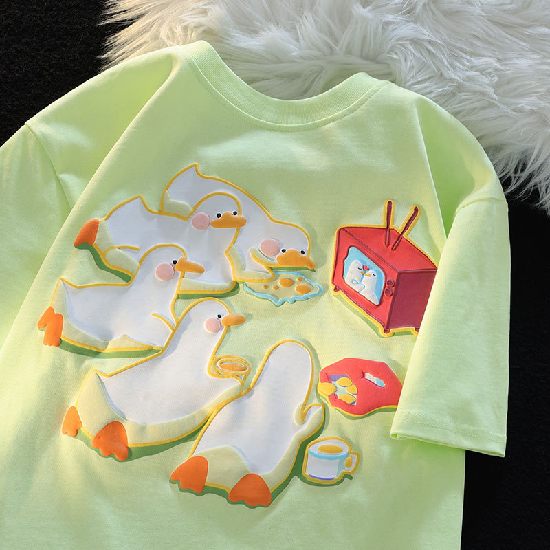 国潮风复古可爱鸭子纯棉大码半袖T恤女胖MM宽松夏季2025新款正肩