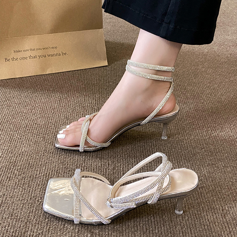 一字扣高跟鞋女细跟2025年夏季新款交叉绑带气质性感露趾水钻凉鞋
