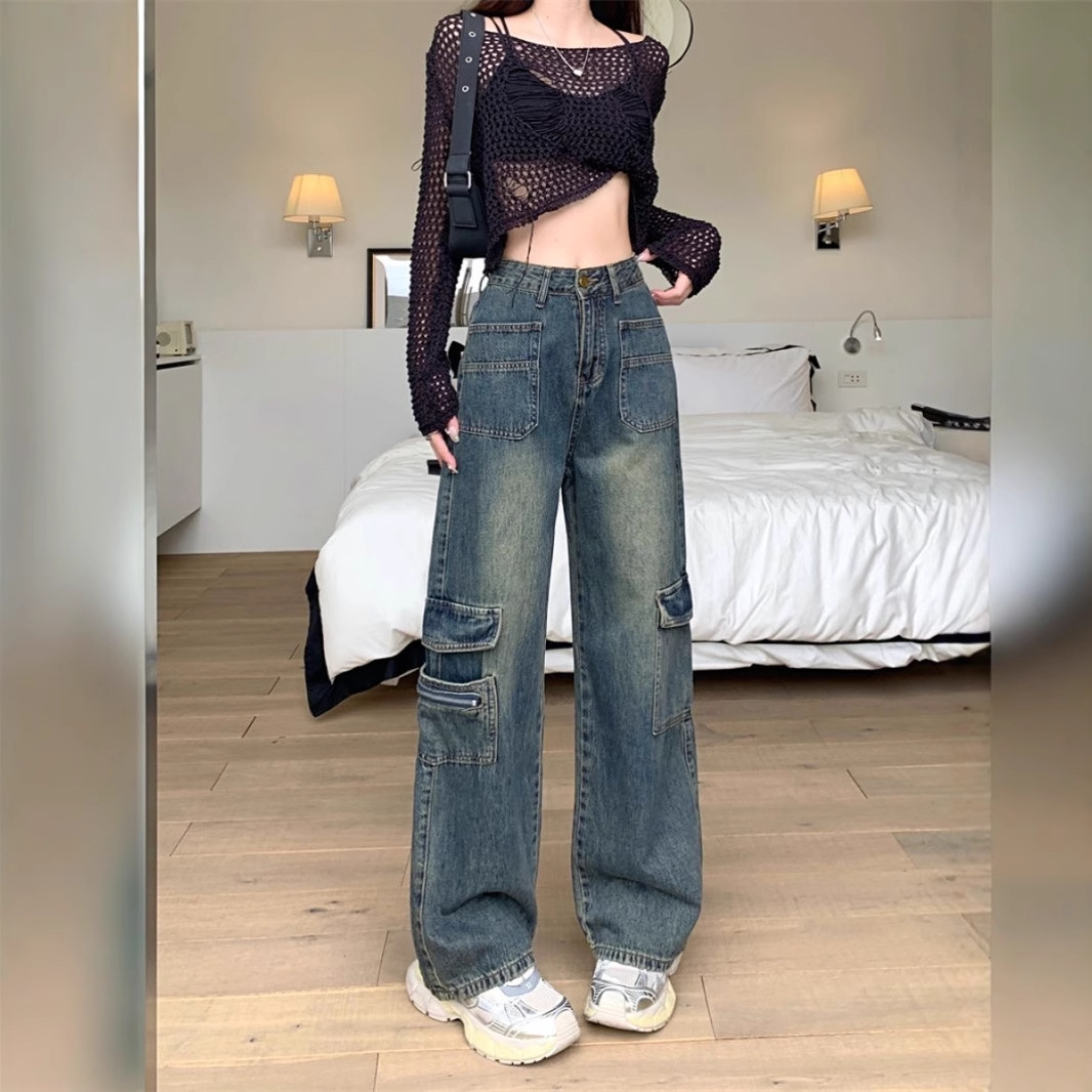高街美式工装牛仔裤女春秋新款大码宽松复古垂感阔腿设计感长裤潮