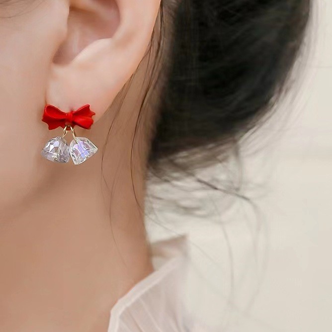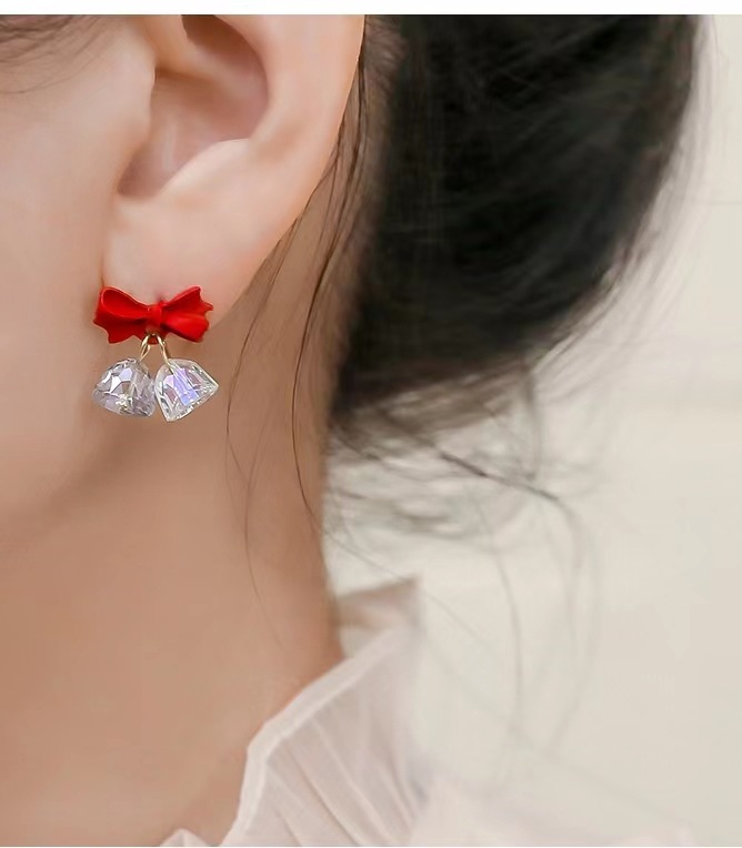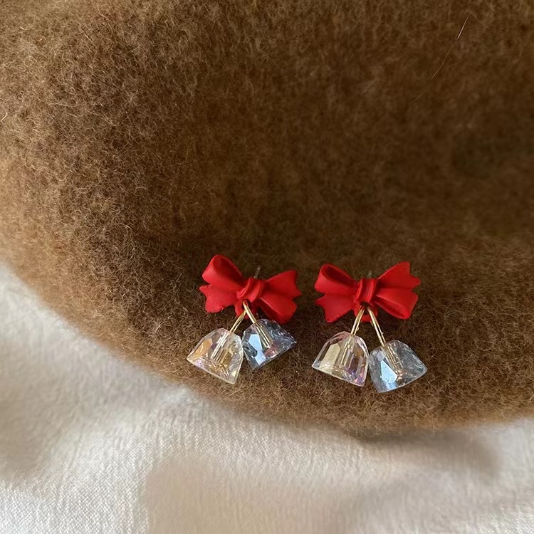 新款酒红色蝴蝶结风铃耳环法式耳饰高级感小众s925银针耳钉