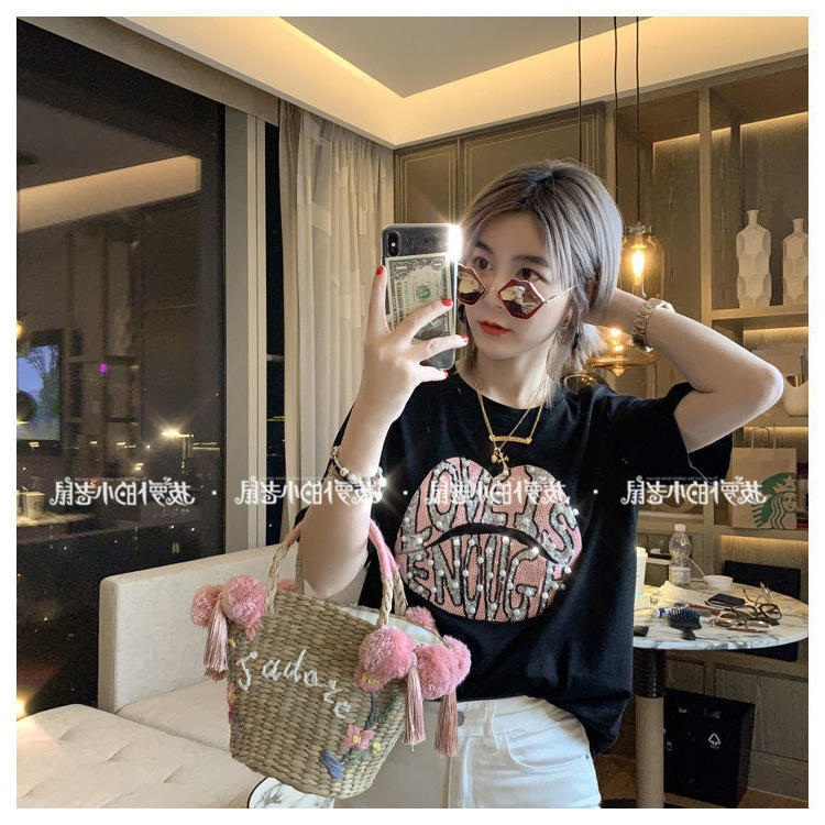 欧货重工钉珠白色短袖t恤女夏时尚欧洲站亮片打底衫字母图案上衣