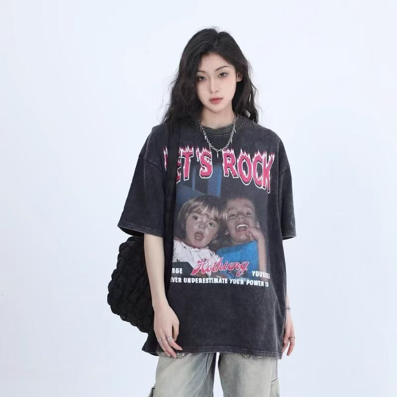 高街美式纯棉欧美街头嘻哈风ins印花休闲洗水做旧宽松洗水T恤上衣