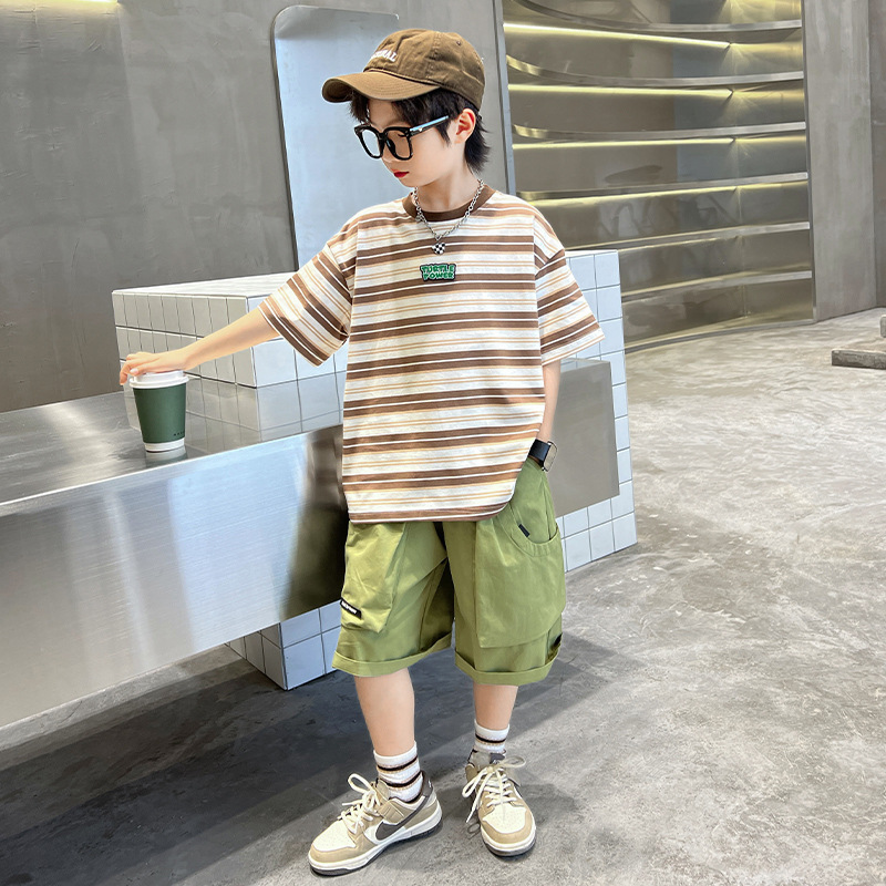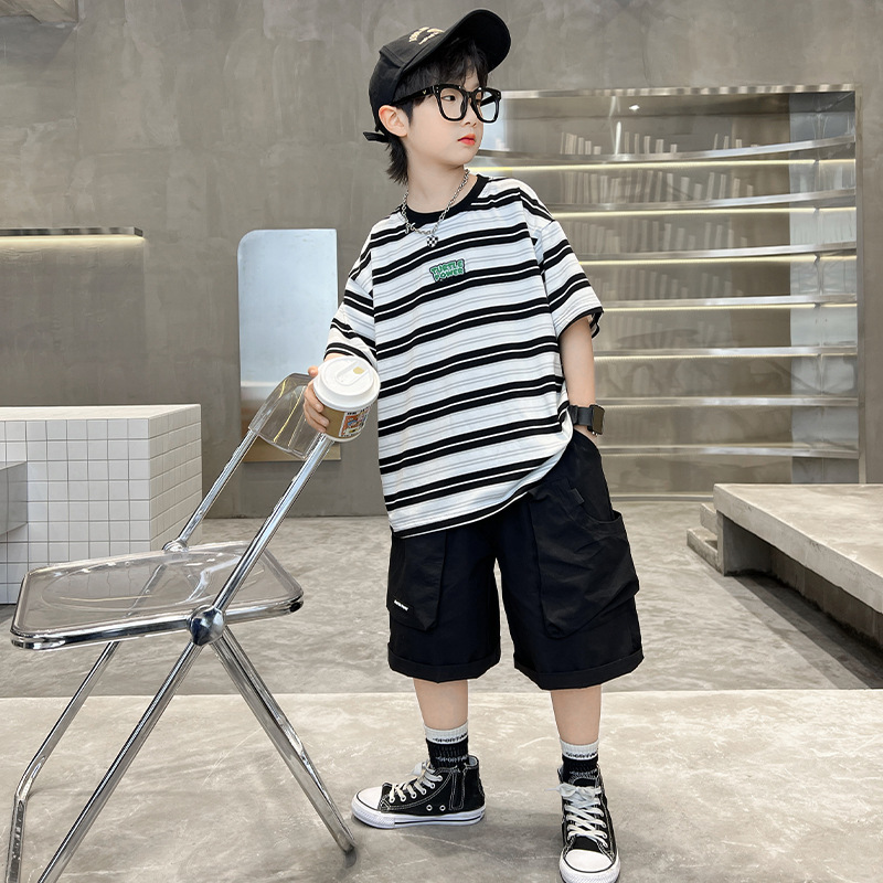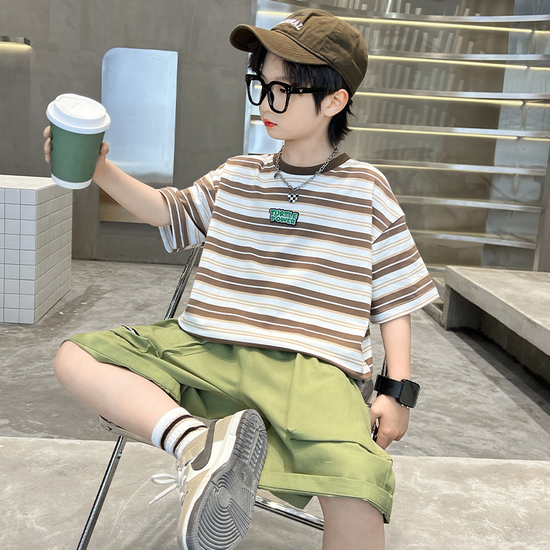 儿童装男童夏季套装2025新款中大童夏款条纹短袖短裤两件套痞帅潮