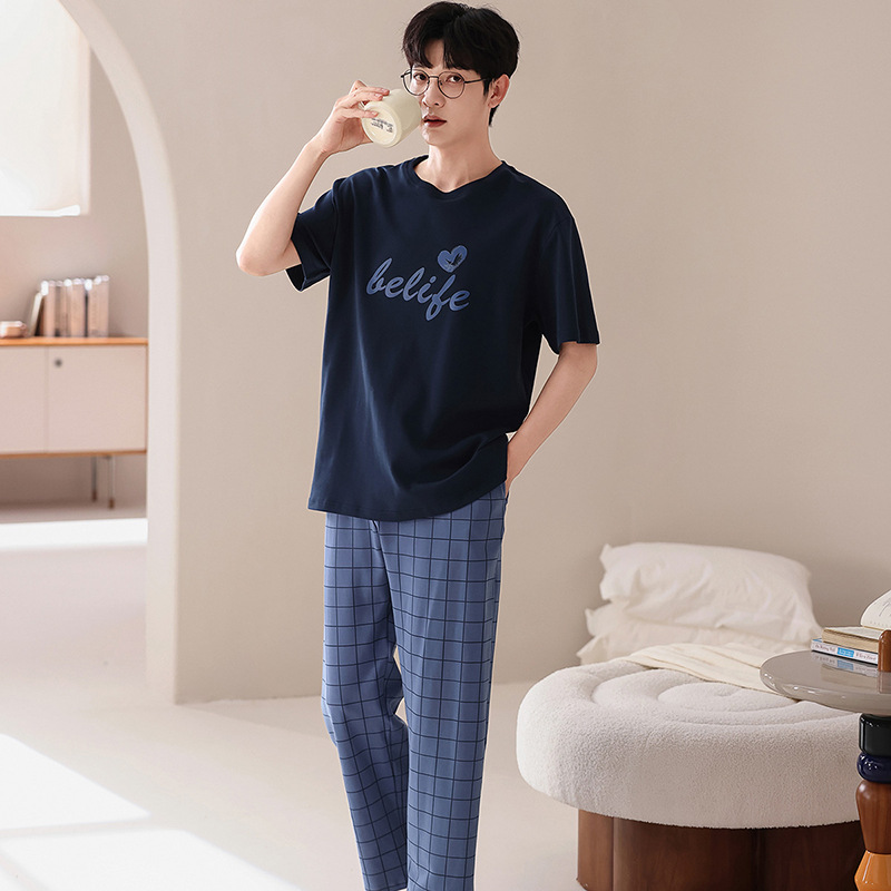 全棉睡衣男士圆领套头短袖长裤春夏款简约休闲居家大码男家居服夏