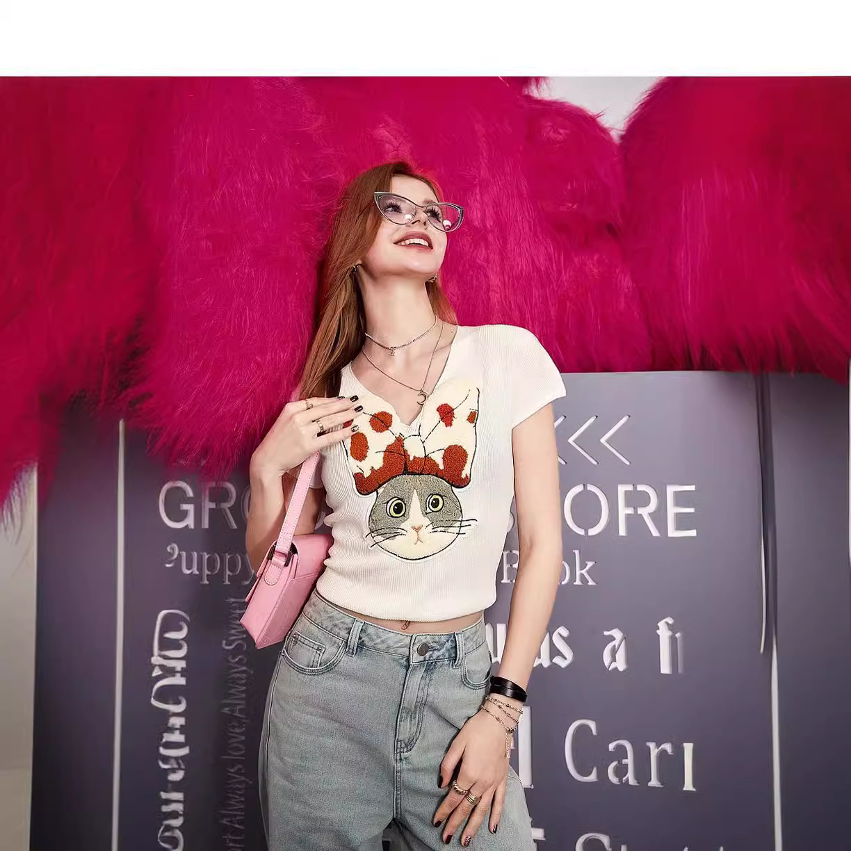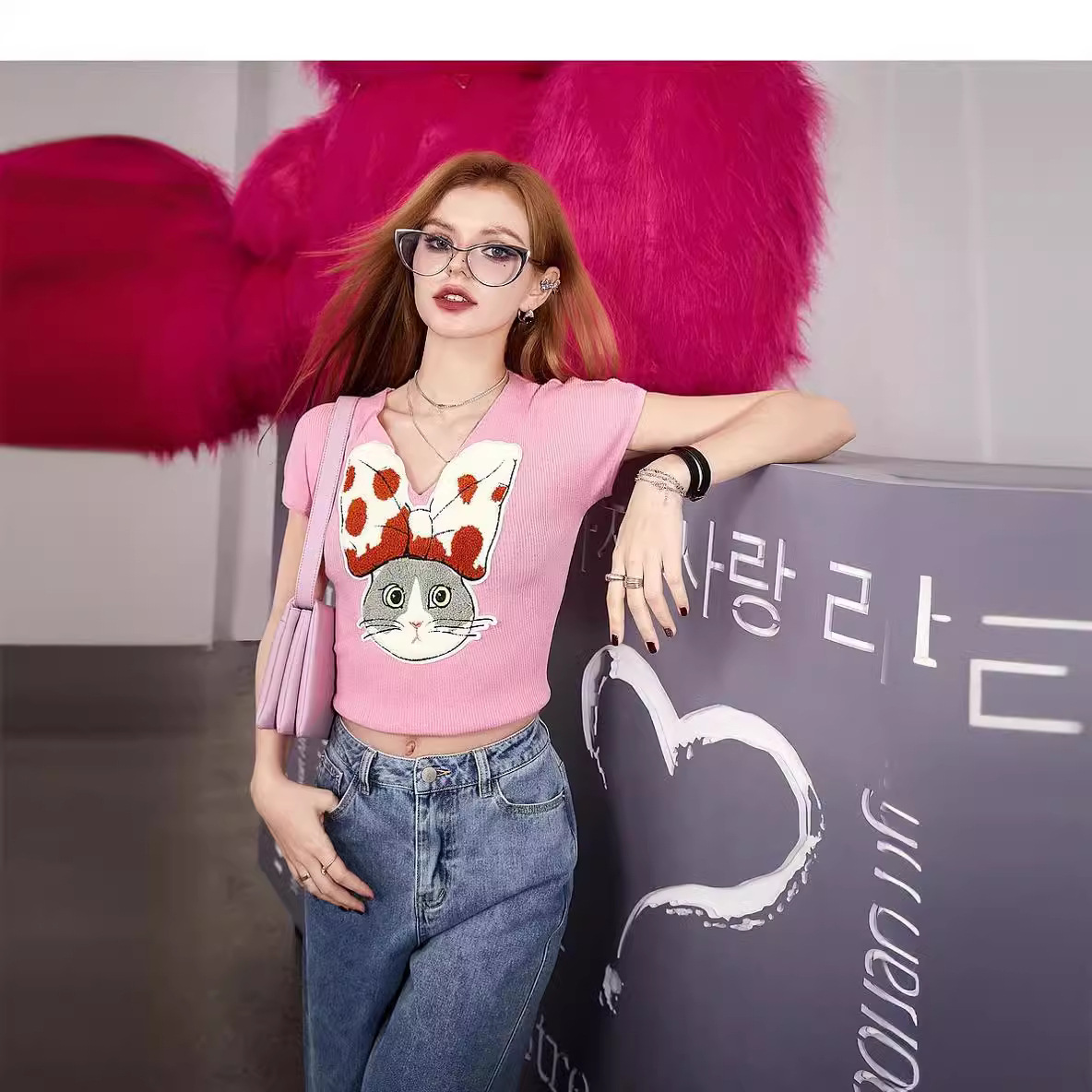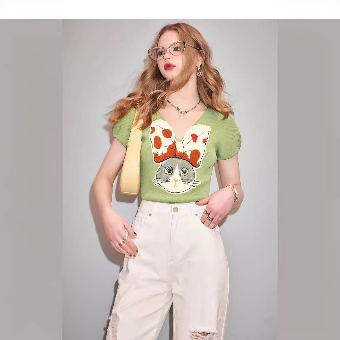 植绒猫咪印花V领针织衫女春季新款小个子短袖上衣