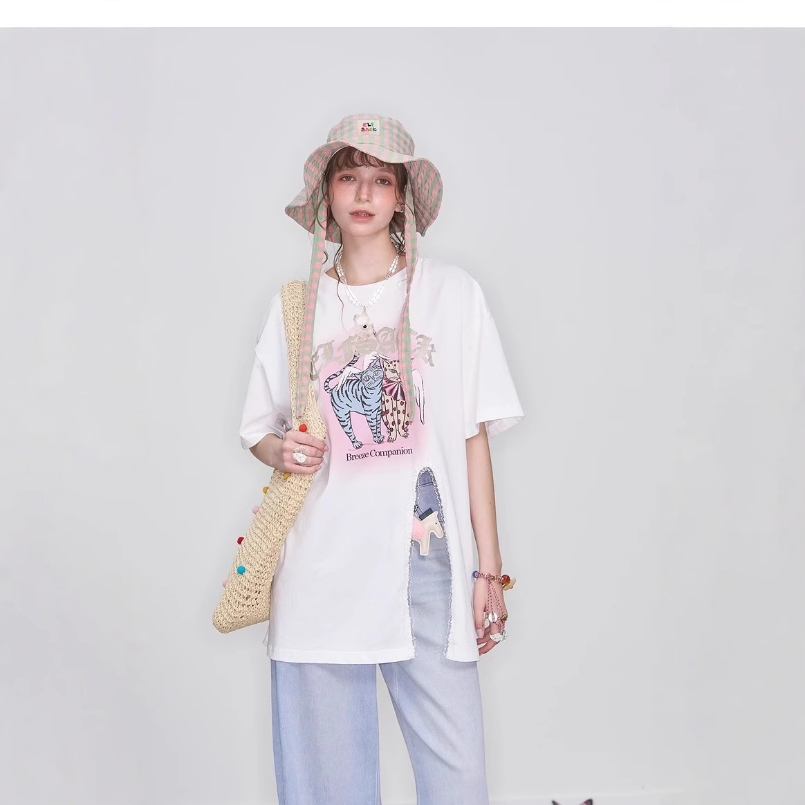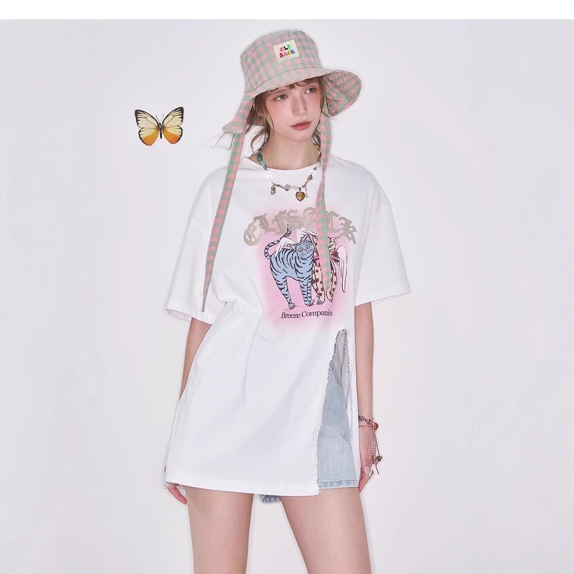 白色印花开叉短袖t恤女2025春新款宽松休闲设计感上衣