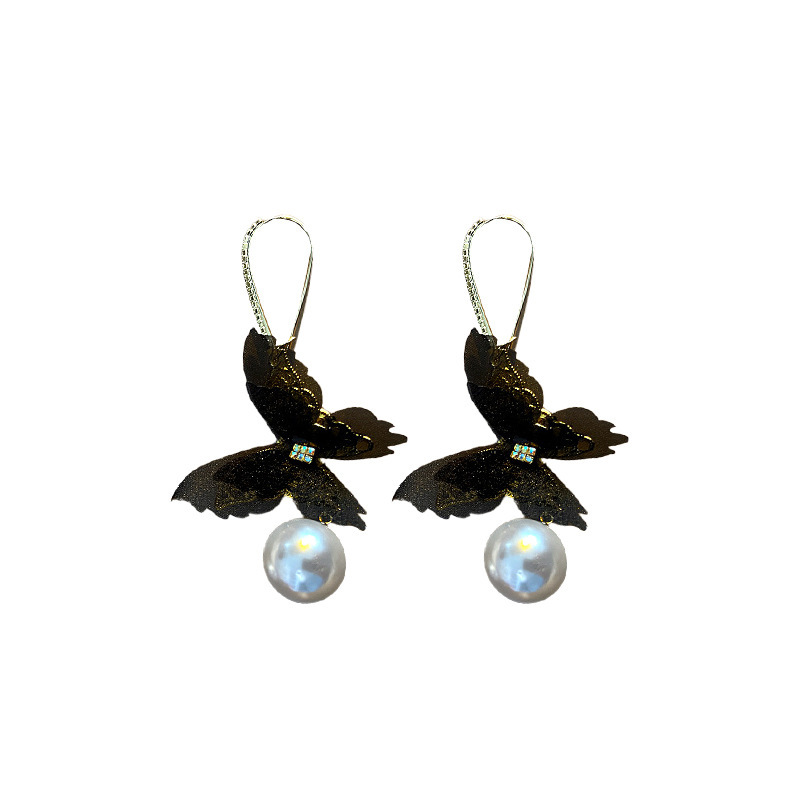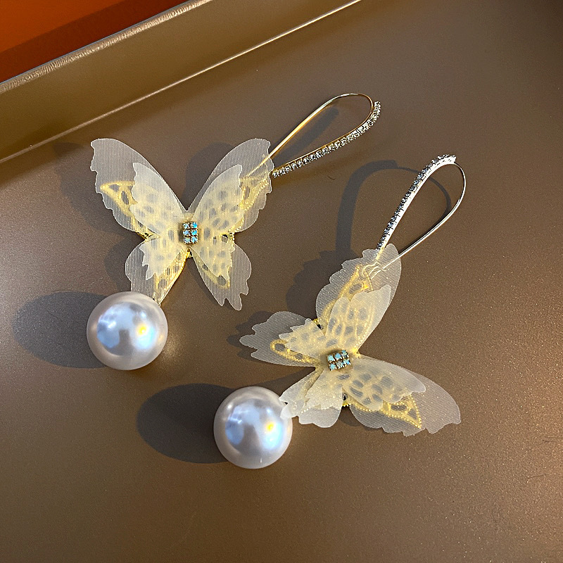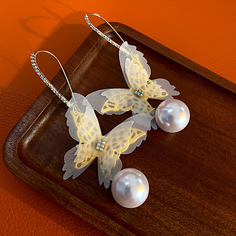 镶钻镂空网纱蝴蝶珍珠耳钩法式浪漫很仙薄纱个性夸张耳环高级