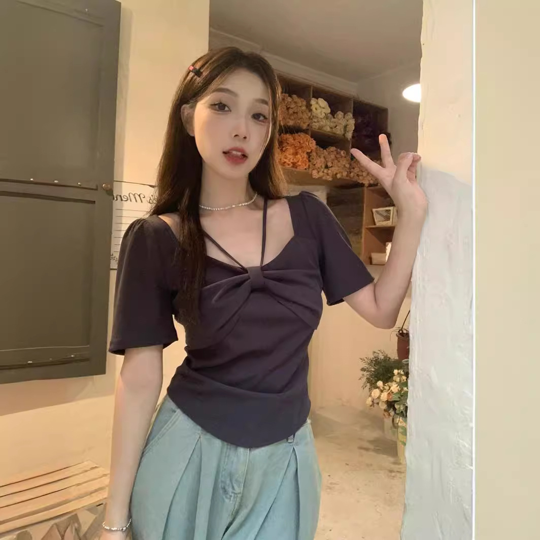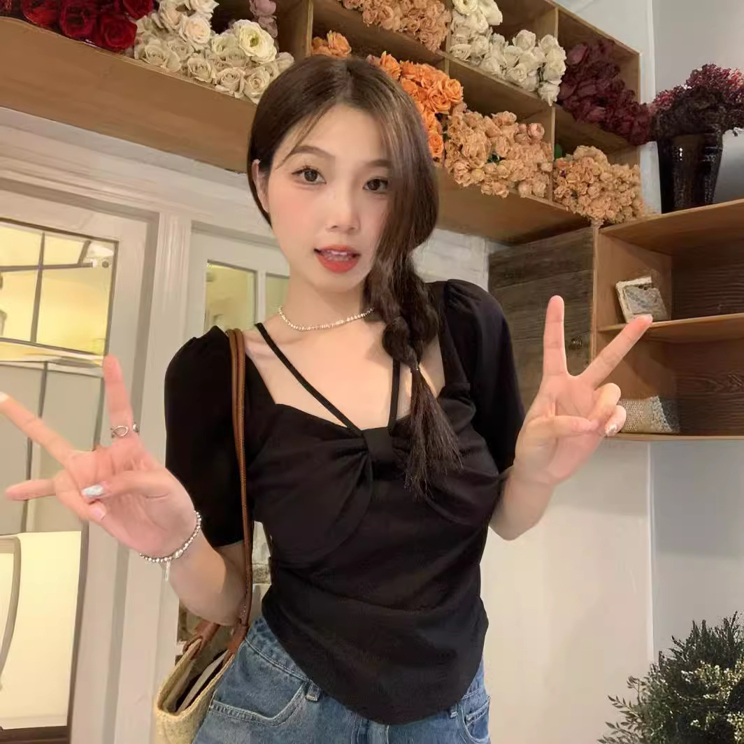 短袖t恤女装设计感小众夏季微胖m辣妹锁骨正肩显瘦短款上衣潮