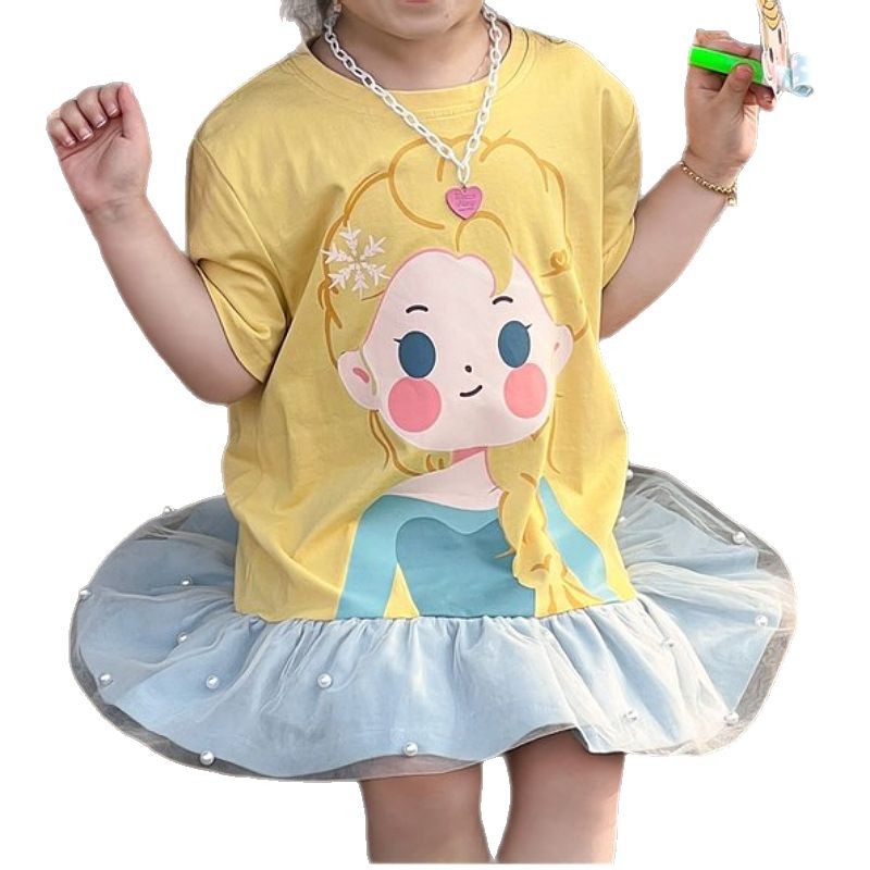 女童连衣裙2025夏季中小童宝宝公主印花网纱下摆短袖宽松T恤裙子