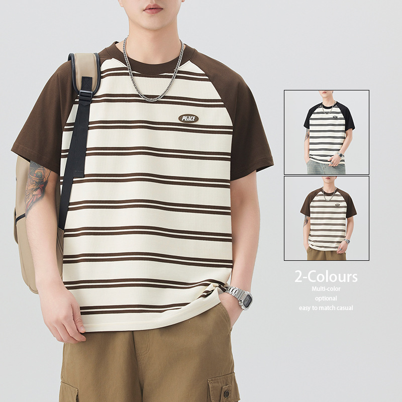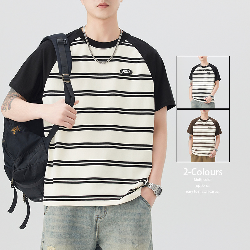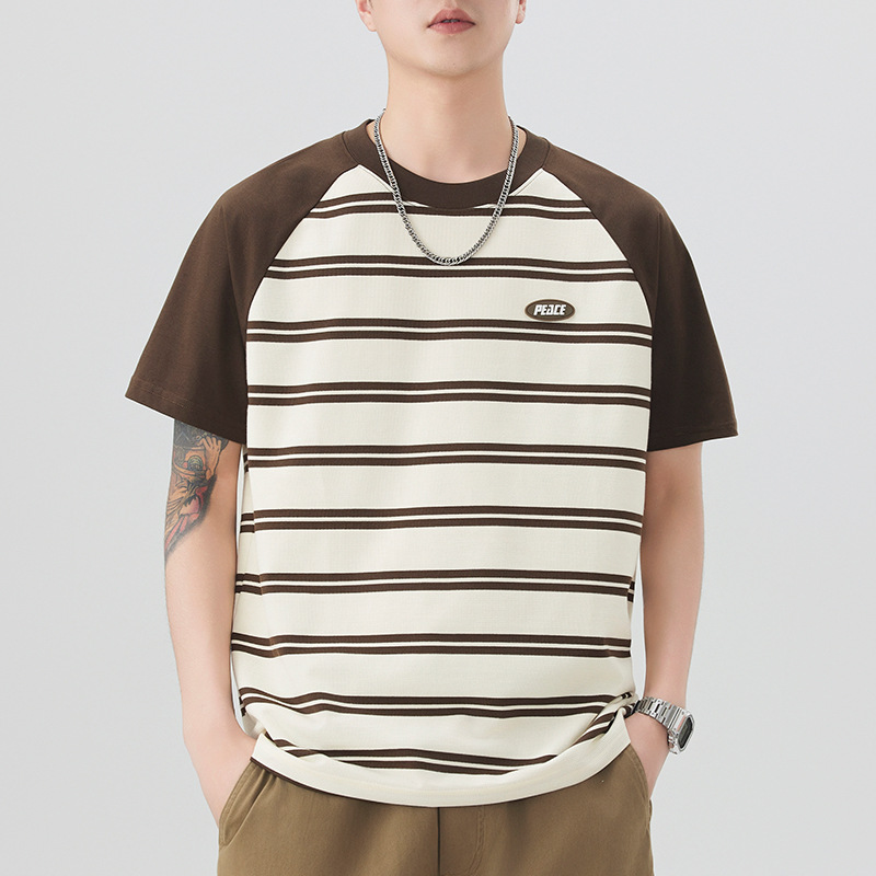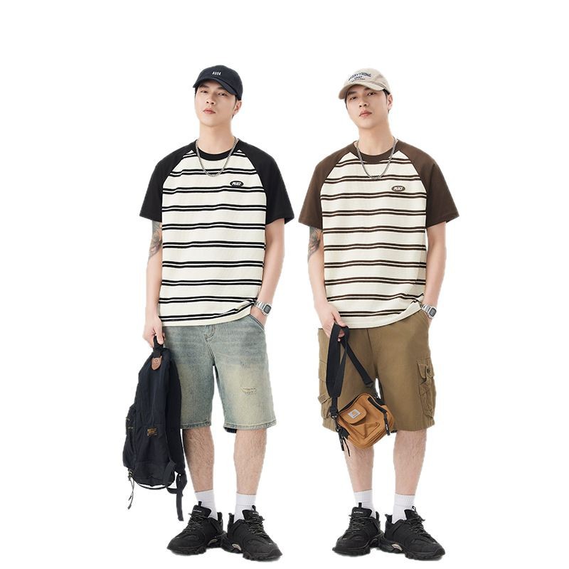 2025年夏季新款美式复古撞色拼接条纹字母印花宽松百搭短袖