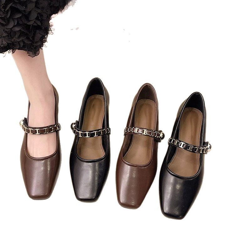 链条复古高跟鞋女单鞋2025春季新款方头一字浅口法式玛丽珍小皮鞋